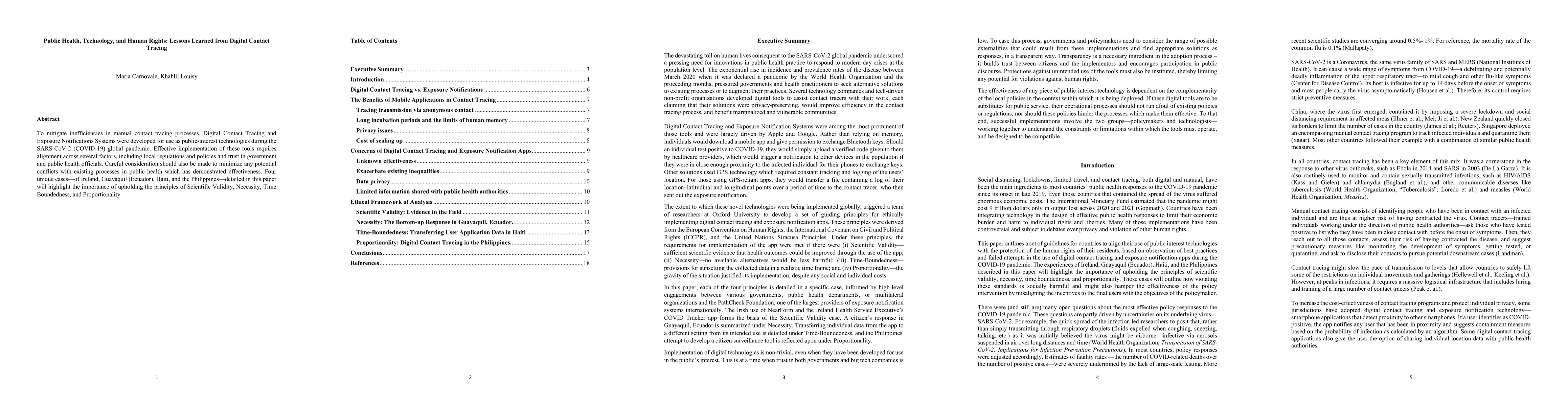 To mitigate inefficiencies in manual contact tracing processes, Digital Contact Tracing and Exposure Notifications Systems were developed for use as public-interest technologies during the SARS-CoV-2 global pandemic. Effective implementation of these tools requires alignment across several factors, including local regulations and policies and trust in government and public health officials. Careful consideration should also be made to minimize any potential conflicts with existing processes in public health which has demonstrated effectiveness. Four unique cases-of Ireland, Guayaquil, Haiti, and the Philippines-detailed in this paper will highlight the importance of upholding the principles of Scientific Validity, Necessity, Time Boundedness, and Proportionality.