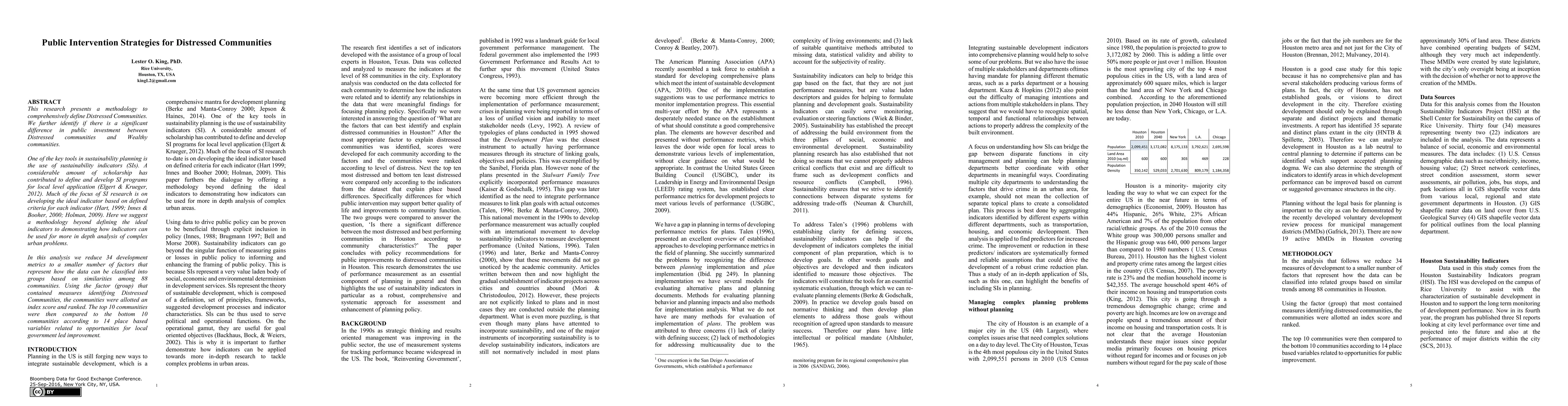 This research presents a methodology to comprehensively define Distressed Communities. We further identify if there is a significant difference in public investment between Distressed communities and Wealthy communities. One of the key tools in sustainability planning is the use of sustainability indicators (Sis). A considerable amount of scholarship has contributed to define and develop SI programs for local level application (Elgert and Krueger, 2012). Much of the focus of SI research is on developing the ideal indicator based on defined criteria for each indicator (Hart, 1999; Innes and Booher 2000; Holman, 2009). Here we suggest a methodology beyond defining the ideal indicators to demonstrating how indicators can be used for more in-depth analysis of complex urban problems. In this analysis we reduce 34 development metrics to a smaller number of factors that represent how the data can be classified into groups based on similarities among 88 communities. Using the factor (group) that contained measures identifying Distressed Communities, the communities were alloted an index score and ranked. The top 10 communities were then compared to the bottom 10 communities according to 14 place based variables related to opportunities for local government led improvement.