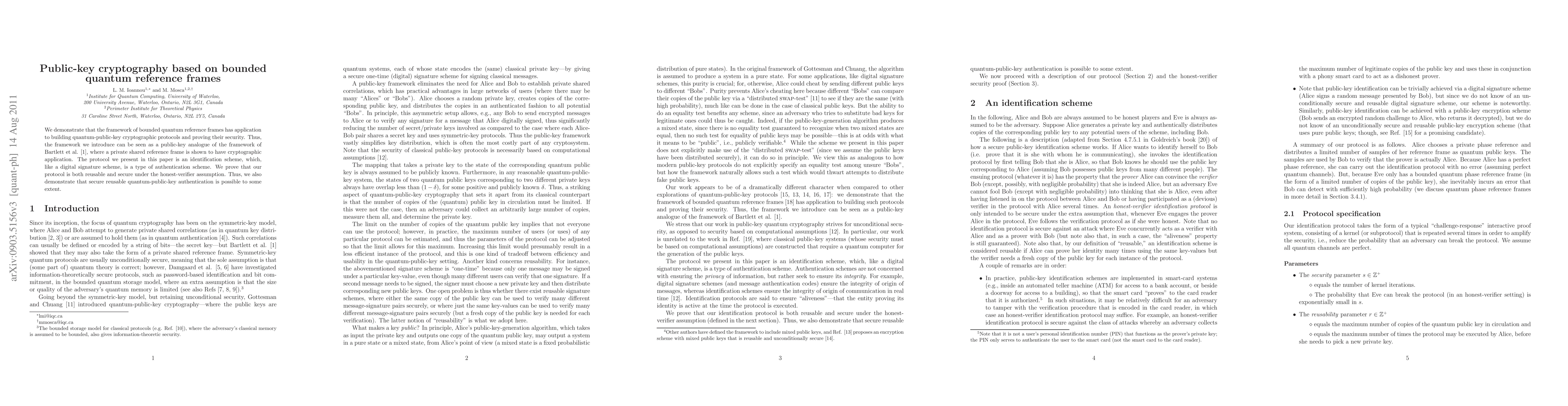 We demonstrate that the framework of bounded quantum reference frames has application to building quantum-public-key cryptographic protocols and proving their security. Thus, the framework we introduce can be seen as a public-key analogue of the framework of Bartlett et al. (Phys. Rev. A 70, 032307), where a private shared reference frame is shown to have cryptographic application. The protocol we present in this paper is an identification scheme, which, like a digital signature scheme, is a type of authentication scheme. We prove that our protocol is both reusable and secure under the honest-verifier assumption. Thus, we also demonstrate that secure reusable quantum-public-key authentication is possible to some extent.