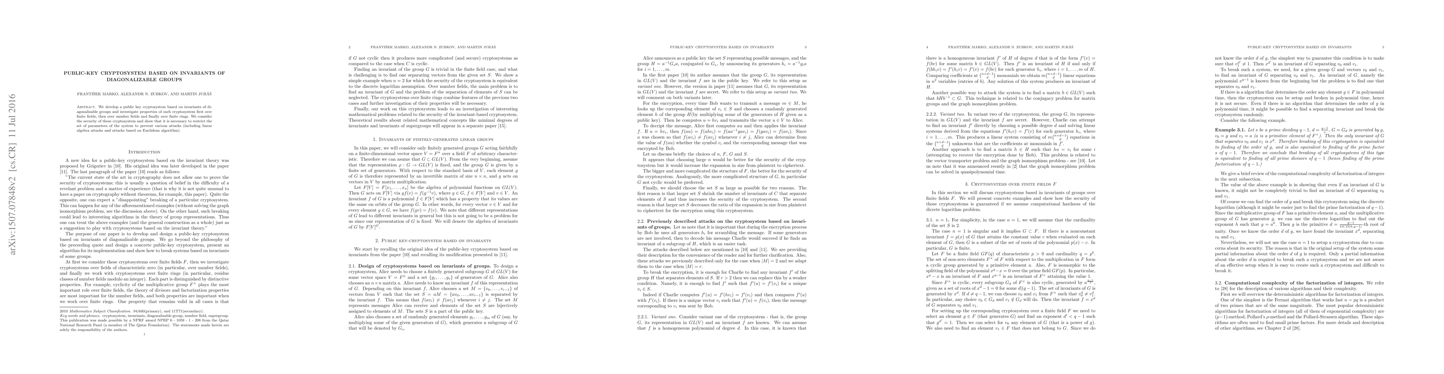 This paper proposes a public-key cryptosystem based on invariants of diagonalizable groups, examining its properties over finite fields, number fields, and finite rings. It highlights the necessity of parameter restrictions to enhance security against linear algebra and Euclidean algorithm-based attacks.