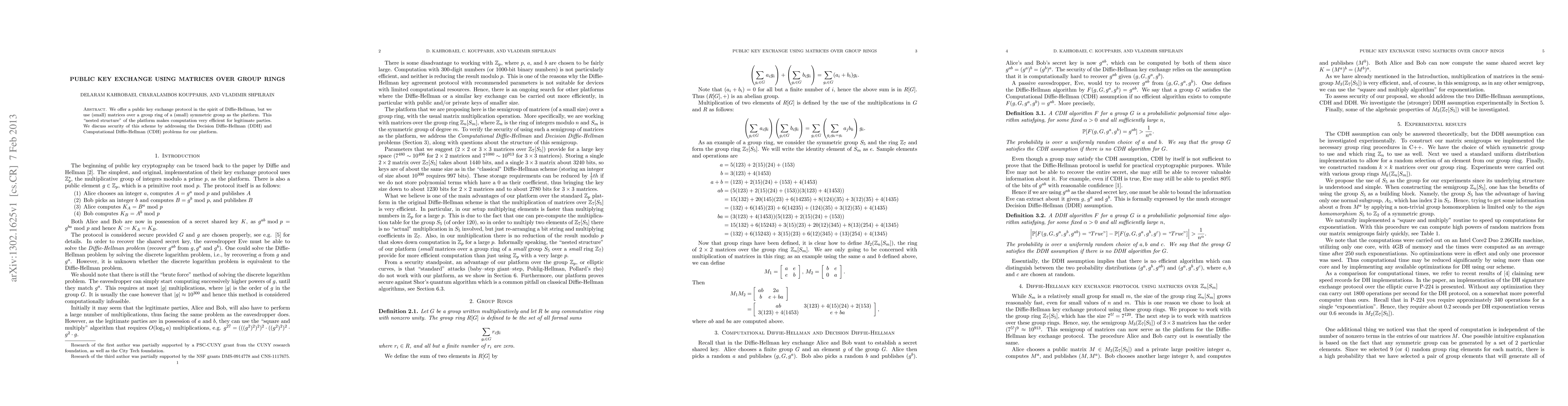 We offer a public key exchange protocol in the spirit of Diffie-Hellman, but we use (small) matrices over a group ring of a (small) symmetric group as the platform. This "nested structure" of the platform makes computation very efficient for legitimate parties. We discuss security of this scheme by addressing the Decision Diffie-Hellman (DDH) and Computational Diffie-Hellman (CDH) problems for our platform.