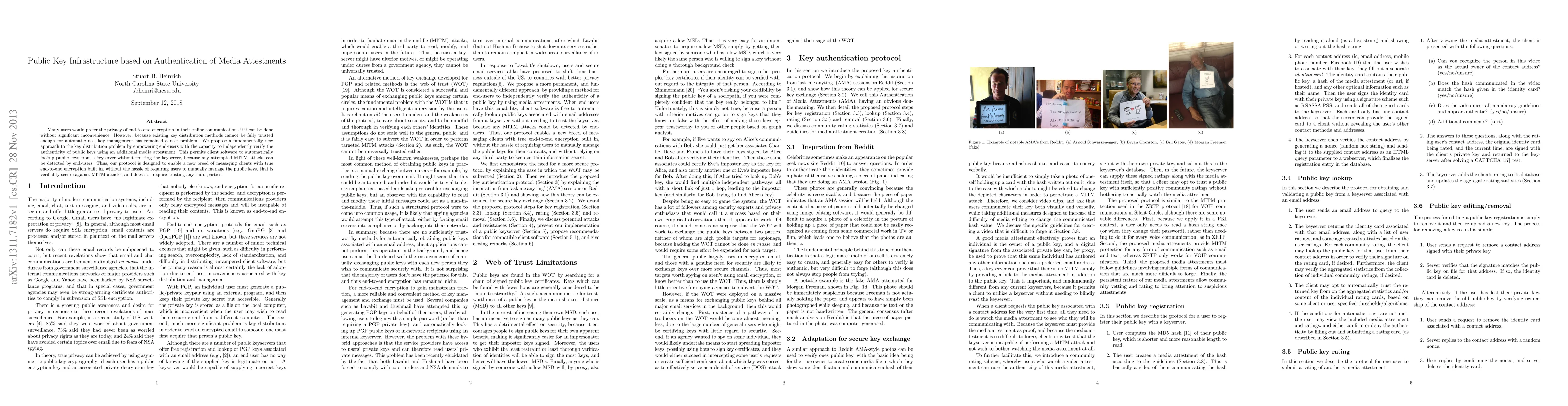 This paper proposes a novel Public Key Infrastructure (PKI) method that allows users to independently verify public keys through media attestments, enabling automatic key lookups from a keyserver without trust, thus enhancing security against MITM attacks and eliminating the need for manual key management.