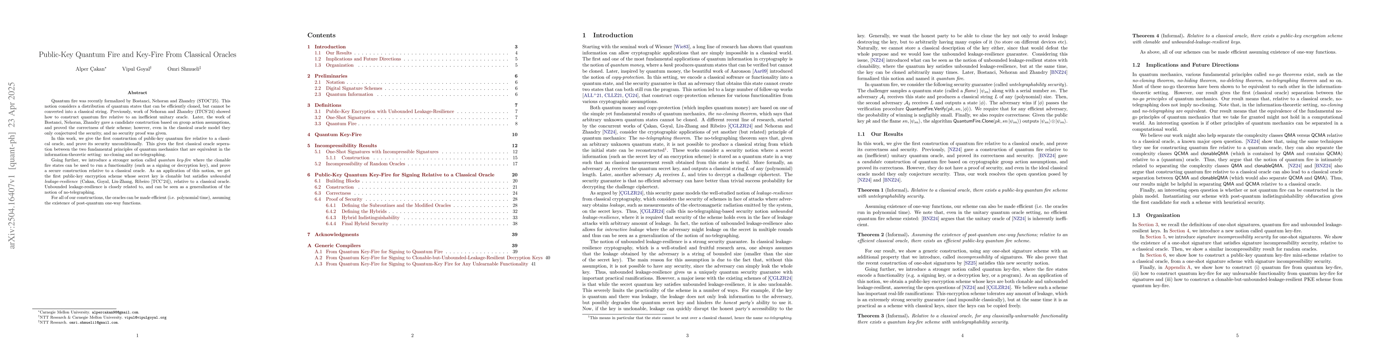 Researchers develop a public-key quantum fire system using classical oracles, providing unconditional security and unbounded leakage-resilience, and a related concept of quantum key-fire that enables secure functionality execution.