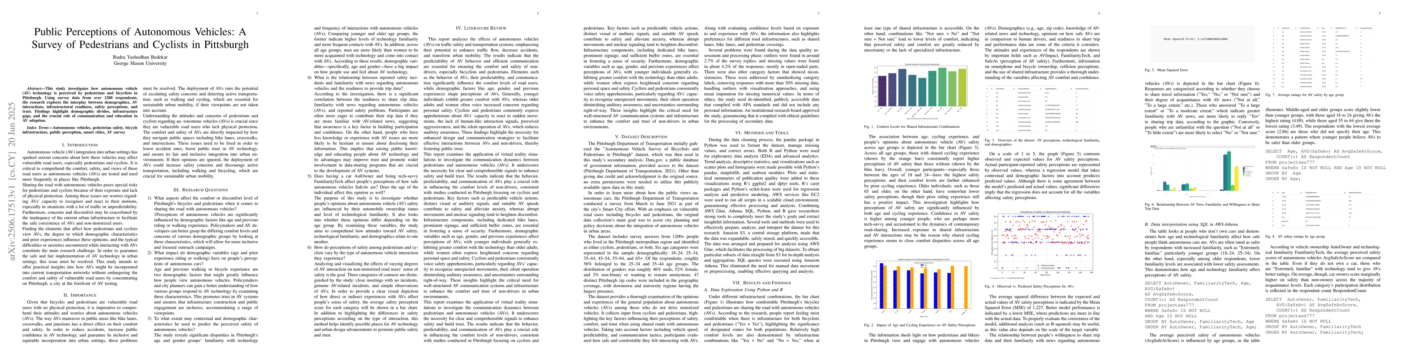 This study investigates how autonomous vehicle(AV) technology is perceived by pedestrians and bicyclists in Pittsburgh. Using survey data from over 1200 respondents, the research explores the interplay between demographics, AV interactions, infrastructural readiness, safety perceptions, and trust. Findings highlight demographic divides, infrastructure gaps, and the crucial role of communication and education in AV adoption.