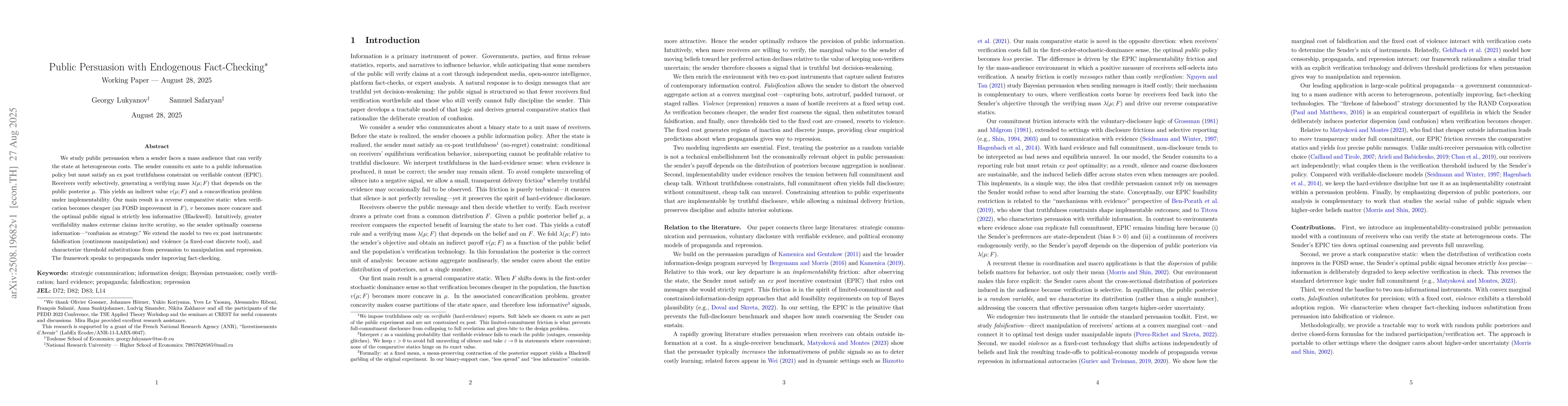 We study public persuasion when a sender faces a mass audience that can verify the state at heterogeneous costs. The sender commits ex ante to a public information policy but must satisfy an ex post truthfulness constraint on verifiable content (EPIC). Receivers verify selectively, generating a verifying mass that depends on the public posterior mu. This yields an indirect value v(mu;F) and a concavification problem under implementability. Our main result is a reverse comparative static: when verification becomes cheaper (an FOSD improvement in F), v becomes more concave and the optimal public signal is strictly less informative (Blackwell). Intuitively, greater verifiability makes extreme claims invite scrutiny, so the sender optimally coarsens information - "confusion as strategy." We extend the model to two ex post instruments: falsification (continuous manipulation) and violence (a fixed-cost discrete tool), and characterize threshold substitutions from persuasion to manipulation and repression. The framework speaks to propaganda under improving fact-checking.