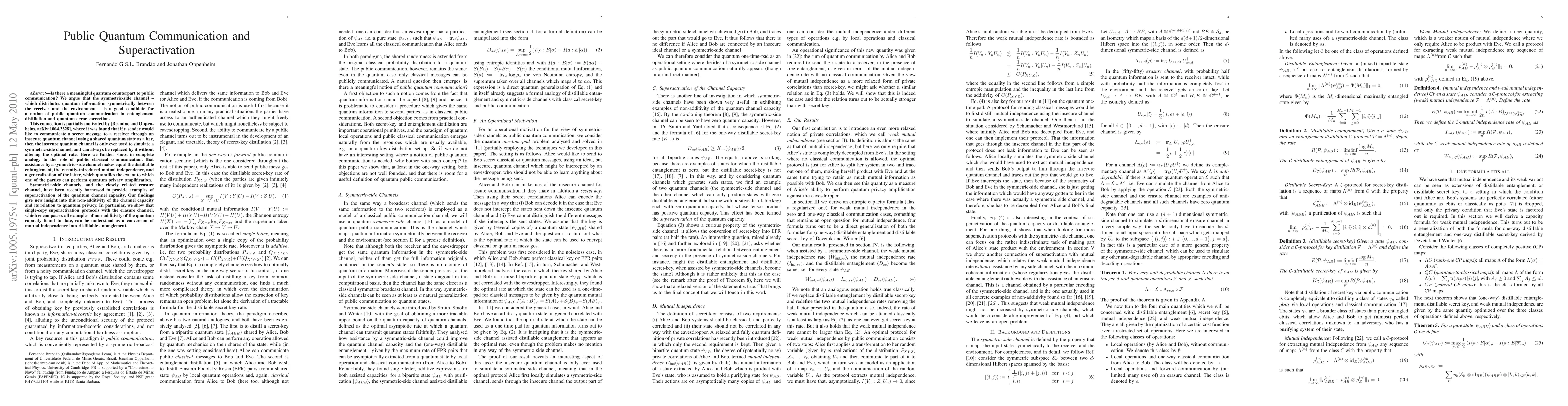 Is there a meaningful quantum counterpart to public communication? We argue that the symmetric-side channel -- which distributes quantum information symmetrically between the receiver and the environment -- is a good candidate for a notion of public quantum communication in entanglement distillation and quantum error correction. This connection is partially motivated by [Brand\~ao and Oppenheim, arXiv:1004.3328], where it was found that if a sender would like to communicate a secret message to a receiver through an insecure quantum channel using a shared quantum state as a key, then the insecure quantum channel is only ever used to simulate a symmetric-side channel, and can always be replaced by it without altering the optimal rate. Here we further show, in complete analogy to the role of public classical communication, that assistance by a symmetric-side channel makes equal the distillable entanglement, the recently-introduced mutual independence, and a generalization of the latter, which quantifies the extent to which one of the parties can perform quantum privacy amplification. Symmetric-side channels, and the closely related erasure channel, have been recently harnessed to provide examples of superactivation of the quantum channel capacity. Our findings give new insight into this non-additivity of the channel capacity and its relation to quantum privacy. In particular, we show that single-copy superactivation protocols with the erasure channel, which encompasses all examples of non-additivity of the quantum capacity found to date, can be understood as a conversion of mutual independence into distillable entanglement.