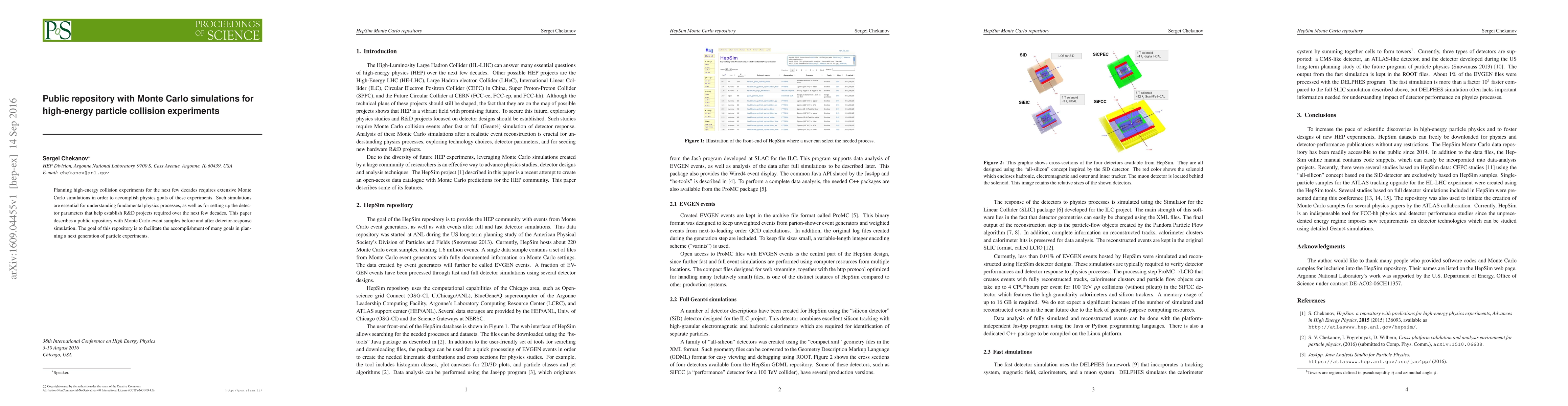 Planning high-energy collision experiments for the next few decades requires extensive Monte Carlo simulations in order to accomplish physics goals of these experiments. Such simulations are essential for understanding fundamental physics processes, as well as for setting up the detector parameters that help establish R&D projects required over the next few decades. This paper describes a public repository with Monte Carlo event samples before and after detector-response simulation. The goal of this repository is to facilitate the accomplishment of many goals in planning a next generation of particle experiments.