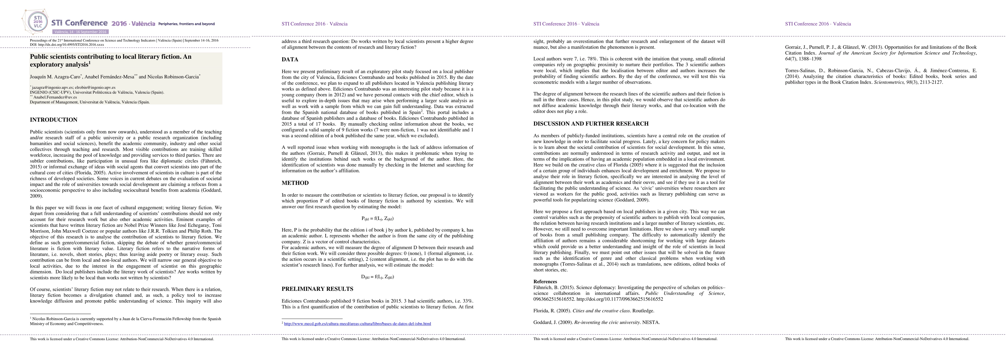 Public scientists (scientists only from now onwards), understood as a member of the teaching and/or research staff of a public university or a public research organization (including humanities and social sciences), benefit the academic community, industry and other social collectives through teaching and research. Active involvement of scientists in culture is part of the richness of developed societies. Some voices in current debates on the evaluation of societal impact and the role of universities towards social development are claiming a refocus from a socioeconomic perspective to also including sociocultural benefits from academiaIn this paper we will focus in one facet of cultural engagement; writing literary fiction. We will narrow our general objective to local activities, due to the interest in the engagement of scientist on this geographic dimension. Do local publishers include the literary work of scientists? Are works written by scientists more likely to be local than works not written by scientists?