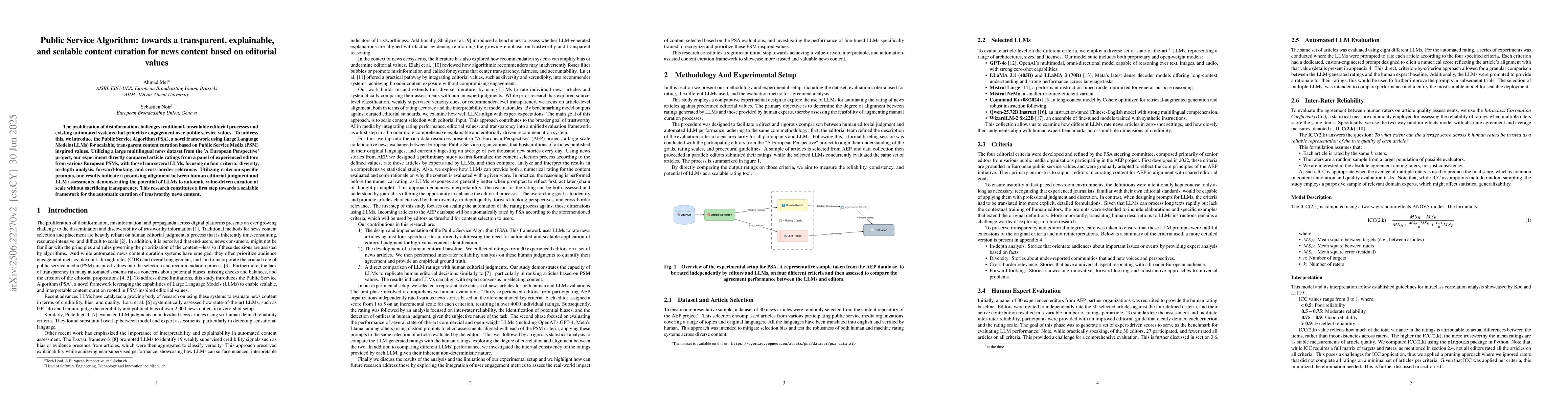 The proliferation of disinformation challenges traditional, unscalable editorial processes and existing automated systems that prioritize engagement over public service values. To address this, we introduce the Public Service Algorithm (PSA), a novel framework using Large Language Models (LLMs) for scalable, transparent content curation based on Public Service Media (PSM) inspired values. Utilizing a large multilingual news dataset from the 'A European Perspective' project, our experiment directly compared article ratings from a panel of experienced editors from various European PSMs, with those from several LLMs, focusing on four criteria: diversity, in-depth analysis, forward-looking, and cross-border relevance. Utilizing criterion-specific prompts, our results indicate a promising alignment between human editorial judgment and LLM assessments, demonstrating the potential of LLMs to automate value-driven curation at scale without sacrificing transparency. This research constitutes a first step towards a scalable framework for the automatic curation of trustworthy news content.
