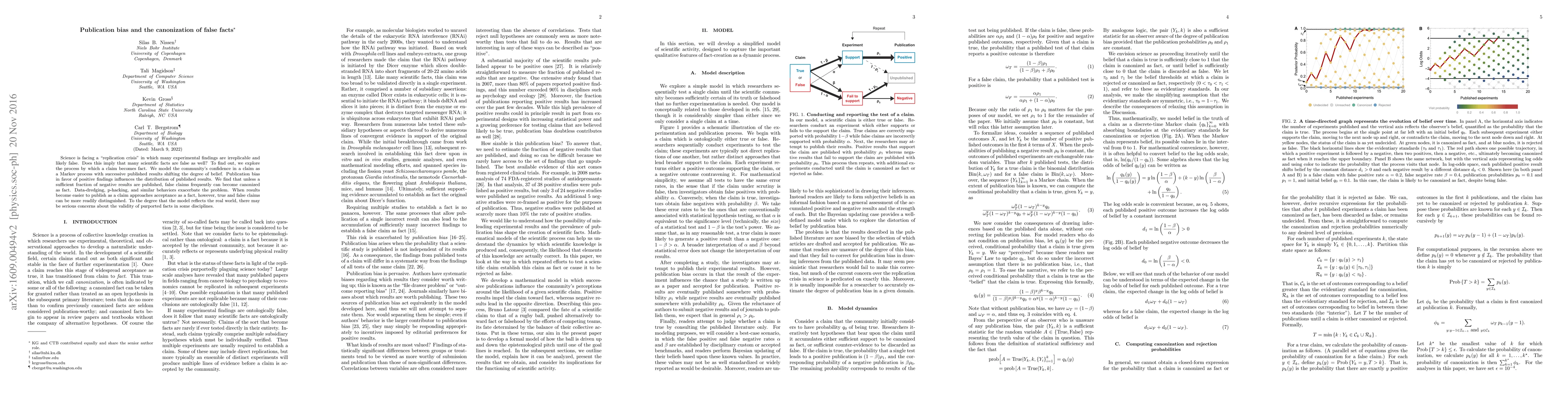 In the process of scientific inquiry, certain claims accumulate enough support to be established as facts. Unfortunately, not every claim accorded the status of fact turns out to be true. In this paper, we model the dynamic process by which claims are canonized as fact through repeated experimental confirmation. The community's confidence in a claim constitutes a Markov process: each successive published result shifts the degree of belief, until sufficient evidence accumulates to accept the claim as fact or to reject it as false. In our model, publication bias --- in which positive results are published preferentially over negative ones --- influences the distribution of published results. We find that when readers do not know the degree of publication bias and thus cannot condition on it, false claims often can be canonized as facts. Unless a sufficient fraction of negative results are published, the scientific process will do a poor job at discriminating false from true claims. This problem is exacerbated when scientists engage in p-hacking, data dredging, and other behaviors that increase the rate at which false positives are published. If negative results become easier to publish as a claim approaches acceptance as a fact, however, true and false claims can be more readily distinguished. To the degree that the model accurately represents current scholarly practice, there will be serious concern about the validity of purported facts in some areas of scientific research.