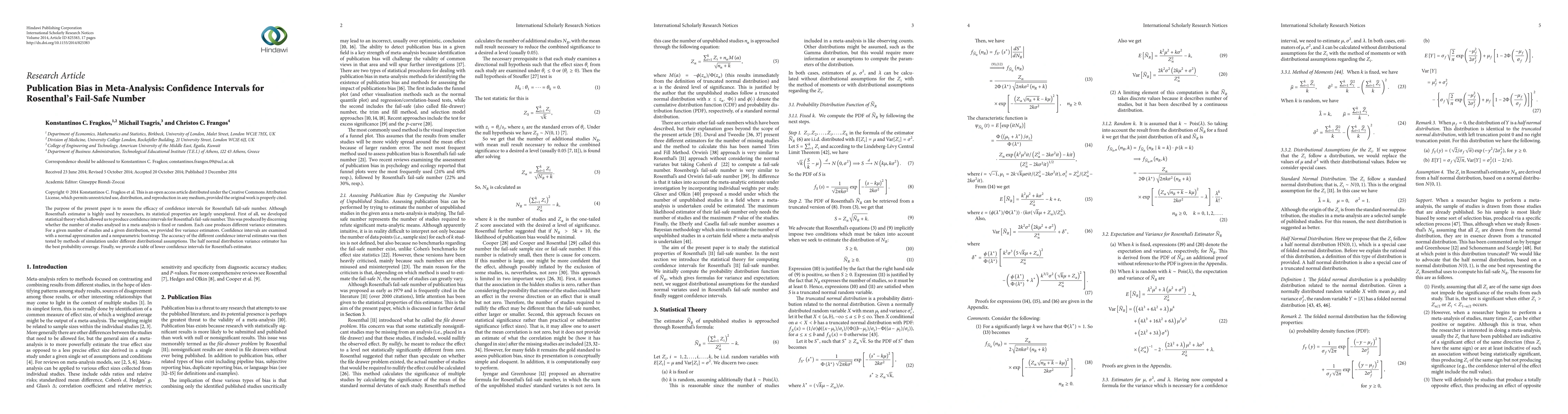 The purpose of the present paper is to assess the efficacy of confidence intervals for Rosenthal's fail-safe number. Although Rosenthal's estimator is highly used by researchers, its statistical properties are largely unexplored. First of all, we developed statistical theory which allowed us to produce confidence intervals for Rosenthal's fail-safe number.This was produced by discerning whether the number of studies analysed in a meta-analysis is fixed or random. Each case produces different variance estimators. For a given number of studies and a given distribution, we provided five variance estimators. Confidence intervals are examined with a normal approximation and a nonparametric bootstrap. The accuracy of the different confidence interval estimates was then tested by methods of simulation under different distributional assumptions. The half normal distribution variance estimator has the best probability coverage. Finally, we provide a table of lower confidence intervals for Rosenthal's estimator.