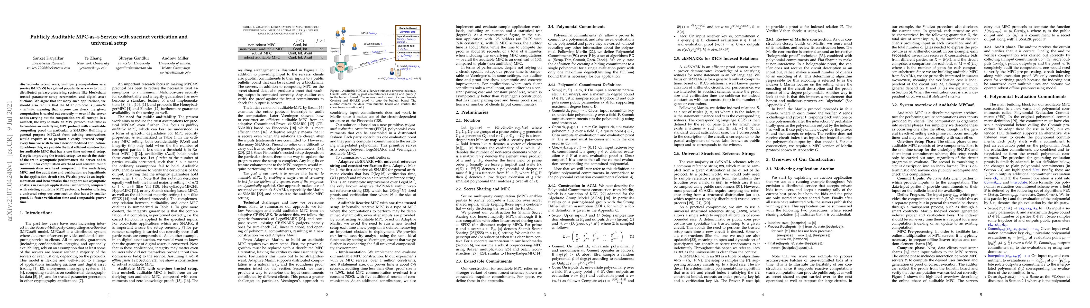 This paper presents a novel publicly auditable multiparty computation as a service (MPCaaS) protocol that combines verifiable computing proofs (SNARKs) with an efficient one-time universal setup, reducing the need for costly trusted setups. The proposed protocol achieves linear computation and constant communication overhead, while offering succinct verification and significantly smaller proof sizes and faster verification times compared to existing protocols.