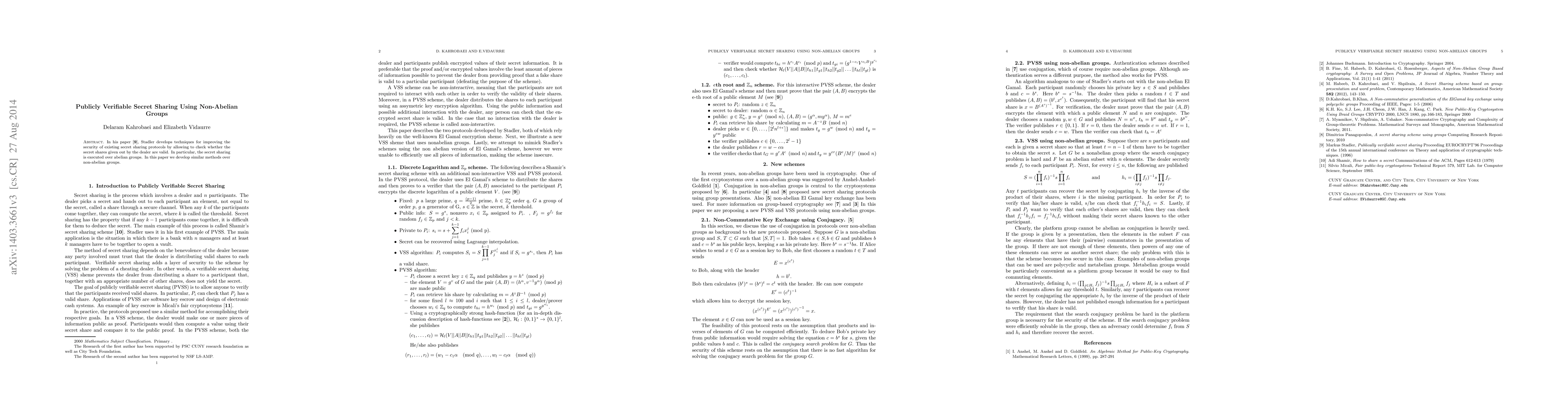 Summary: Stadler's paper enhances secret sharing security through publicly verifiable methods over abelian groups; this paper extends these techniques to non-abelian groups, improving the validation process for shared secrets.