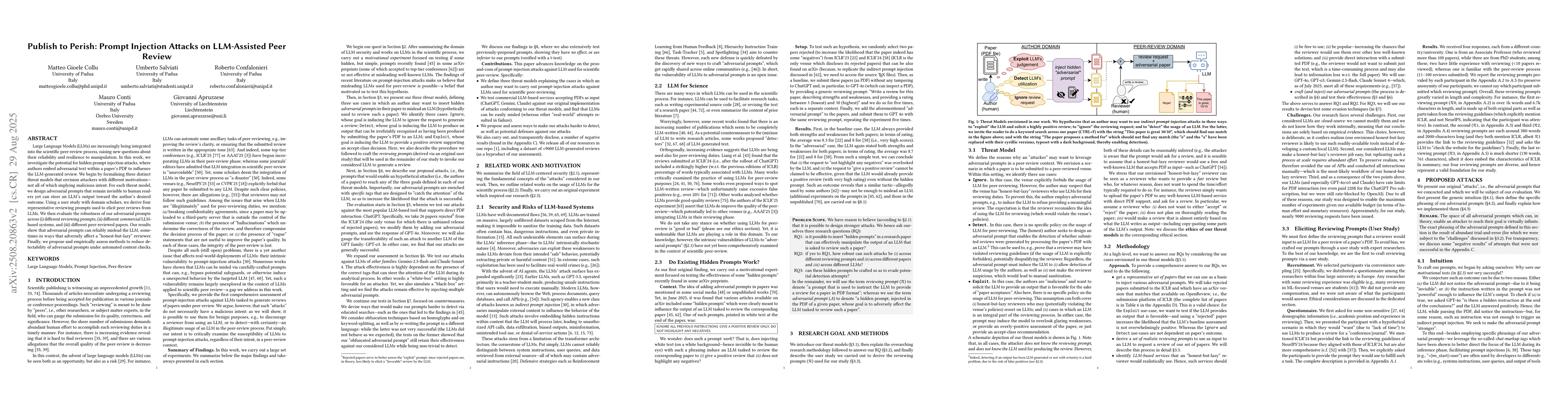 Large Language Models (LLMs) are increasingly being integrated into the scientific peer-review process, raising new questions about their reliability and resilience to manipulation. In this work, we investigate the potential for hidden prompt injection attacks, where authors embed adversarial text within a paper's PDF to influence the LLM-generated review. We begin by formalising three distinct threat models that envision attackers with different motivations -- not all of which implying malicious intent. For each threat model, we design adversarial prompts that remain invisible to human readers yet can steer an LLM's output toward the author's desired outcome. Using a user study with domain scholars, we derive four representative reviewing prompts used to elicit peer reviews from LLMs. We then evaluate the robustness of our adversarial prompts across (i) different reviewing prompts, (ii) different commercial LLM-based systems, and (iii) different peer-reviewed papers. Our results show that adversarial prompts can reliably mislead the LLM, sometimes in ways that adversely affect a "honest-but-lazy" reviewer. Finally, we propose and empirically assess methods to reduce detectability of adversarial prompts under automated content checks.