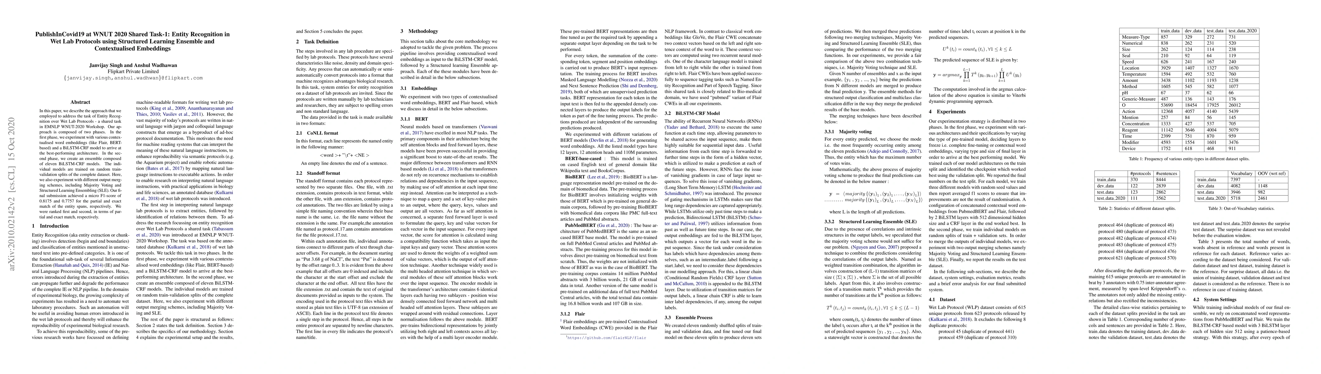 In this paper, we describe the approach that we employed to address the task of Entity Recognition over Wet Lab Protocols -- a shared task in EMNLP WNUT-2020 Workshop. Our approach is composed of two phases. In the first phase, we experiment with various contextualised word embeddings (like Flair, BERT-based) and a BiLSTM-CRF model to arrive at the best-performing architecture. In the second phase, we create an ensemble composed of eleven BiLSTM-CRF models. The individual models are trained on random train-validation splits of the complete dataset. Here, we also experiment with different output merging schemes, including Majority Voting and Structured Learning Ensembling (SLE). Our final submission achieved a micro F1-score of 0.8175 and 0.7757 for the partial and exact match of the entity spans, respectively. We were ranked first and second, in terms of partial and exact match, respectively.