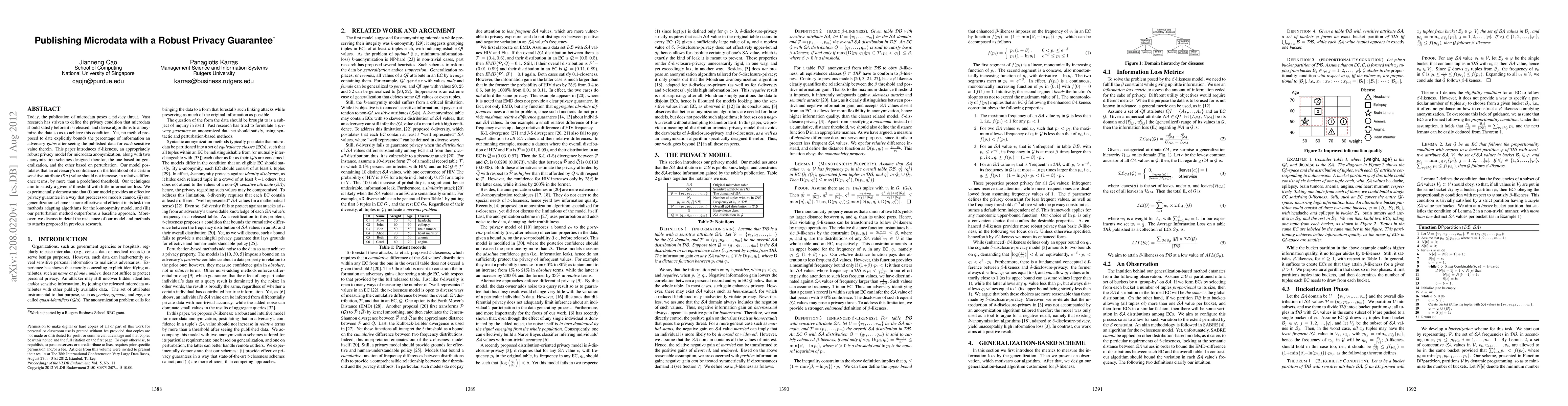 This paper introduces beta-likeness, a robust privacy model for microdata anonymization, and presents two anonymization schemes—generalization and perturbation—to achieve this model. The model ensures that adversaries' confidence in sensitive attribute values does not increase beyond a predefined threshold, providing superior privacy guarantees compared to previous methods.