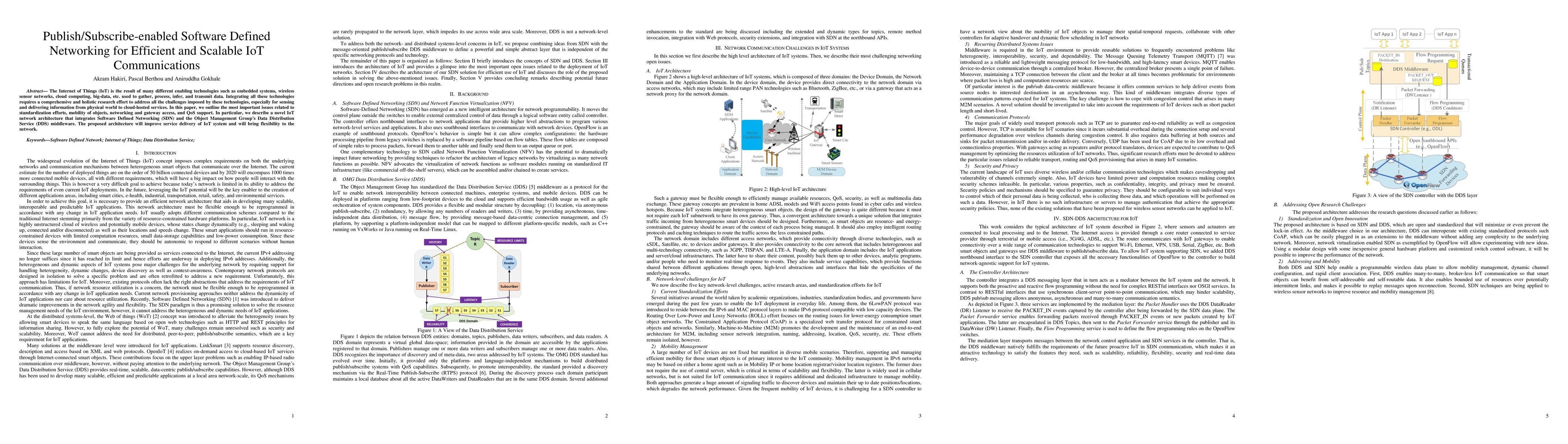 - The Internet of Things (IoT) is the result of many different enabling technologies such as embedded systems, wireless sensor networks, cloud computing, big-data, etc. used to gather, process, infer, and transmit data. Integrating all these technologies requires a comprehensive and holistic research effort to address all the challenges imposed by these technologies, especially for sensing and delivering information from physical world to cloud-hosted services. In this paper, we outline the most important issues related to standardization efforts, mobility of objects, networking and gateway access, and QoS support. In particular, we describe a novel IoT network architecture that integrates Software Defined Networking (SDN) and the Object Management Group's Data Distribution Service (DDS) middleware. The proposed architecture will improve service delivery of IoT system and will bring flexibility to the network.