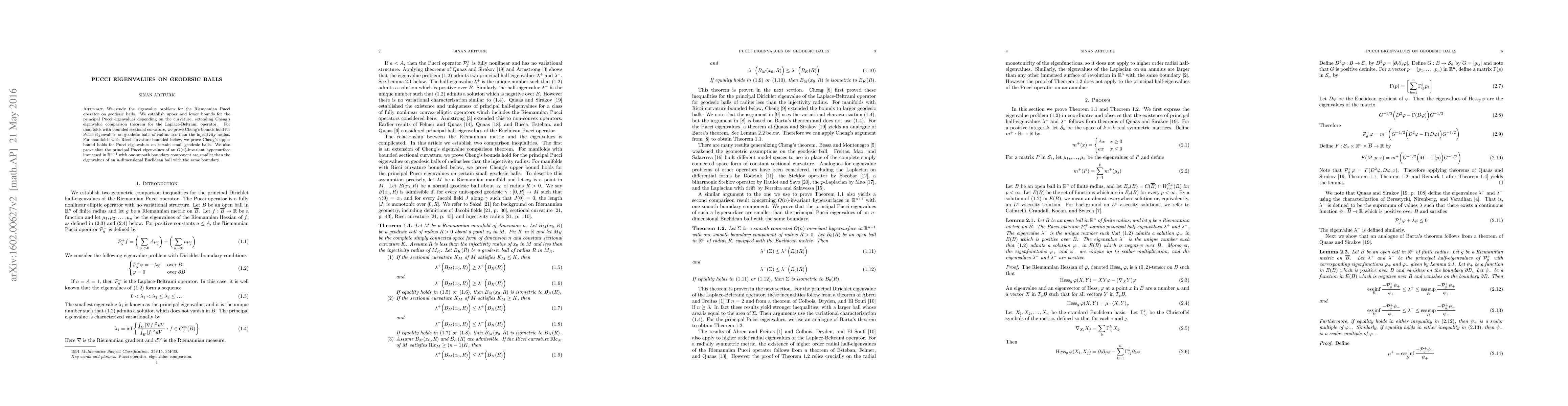 We study the eigenvalue problem for the Riemannian Pucci operator on geodesic balls. We establish upper and lower bounds for the principal Pucci eigenvalues depending on the curvature, extending Cheng's eigenvalue comparison theorem for the Laplace-Beltrami operator. For manifolds with bounded sectional curvature, we prove Cheng's bounds hold for Pucci eigenvalues on geodesic balls of radius less than the injectivity radius. For manifolds with Ricci curvature bounded below, we prove Cheng's upper bound holds for Pucci eigenvalues on certain small geodesic balls. We also prove that the principal Pucci eigenvalues of an $O(n)$-invariant hypersurface immersed in $\mathbb{R}^{n+1}$ with one smooth boundary component are smaller than the eigenvalues of an $n$-dimensional Euclidean ball with the same boundary.