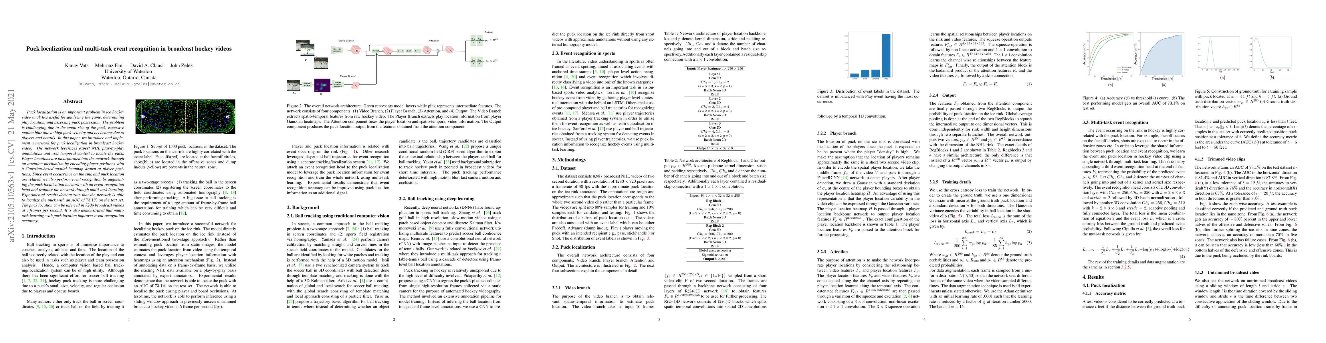A network is introduced for puck localization in broadcast hockey videos, achieving an AUC of 73.1% on the test set, and also improving event recognition accuracy through multi-task learning.