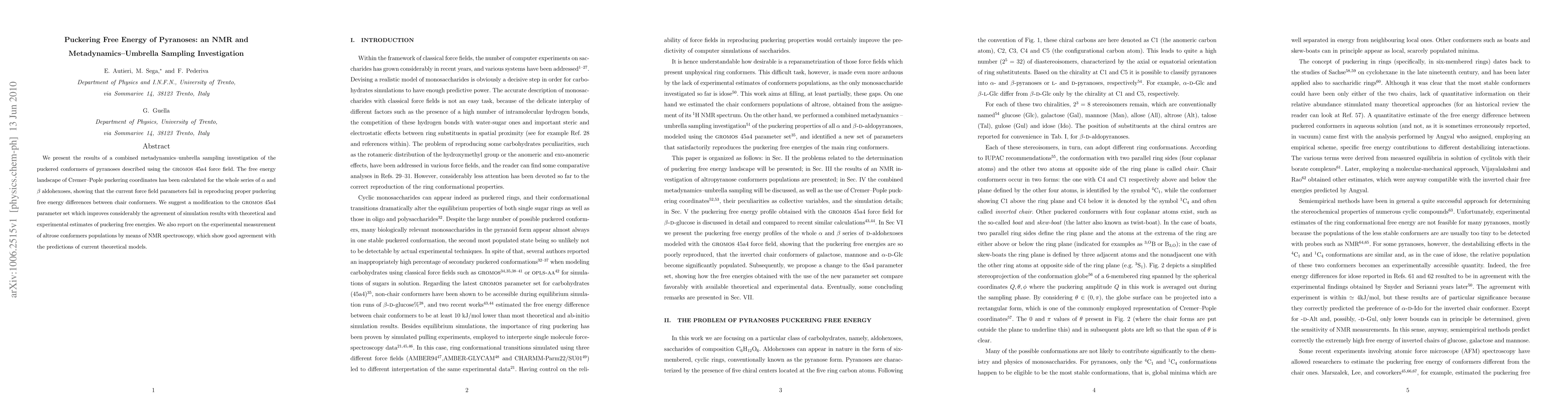 This study combines metadynamics and umbrella sampling to investigate the puckering free energy of pyranoses, revealing that the current GROMOS 45a4 force field fails to accurately reproduce puckering free energy differences. The authors propose modifications to the force field parameters to improve agreement with experimental and theoretical estimates.