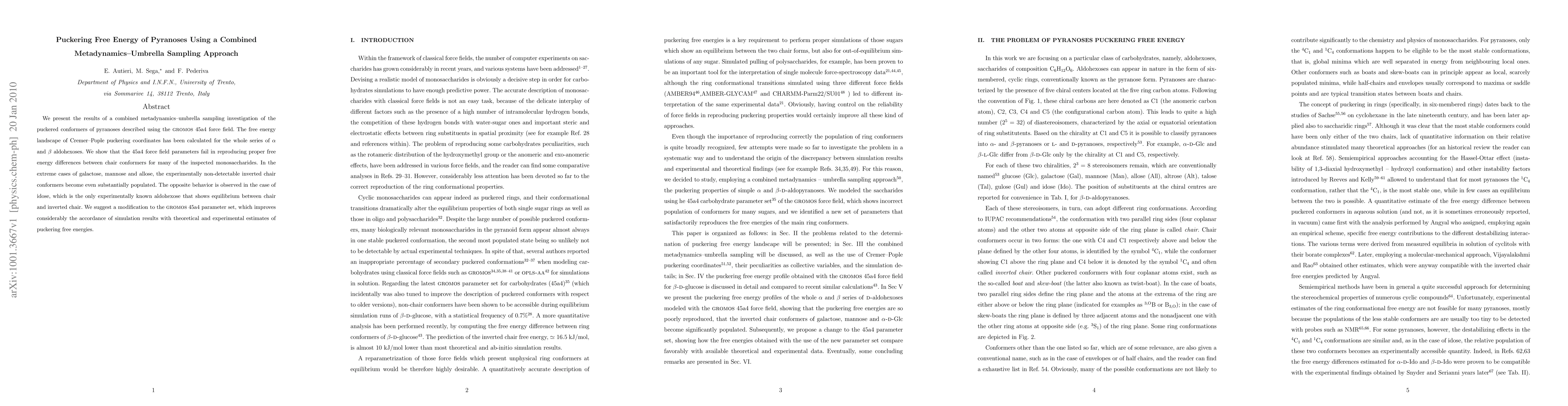 This study combines metadynamics-umbrella sampling to investigate the puckering free energy of pyranoses using the gromos 45a4 force field, revealing significant discrepancies in the force field's ability to reproduce correct free energy differences between chair conformers. Proposed modifications to the force field parameters improve agreement with experimental data.