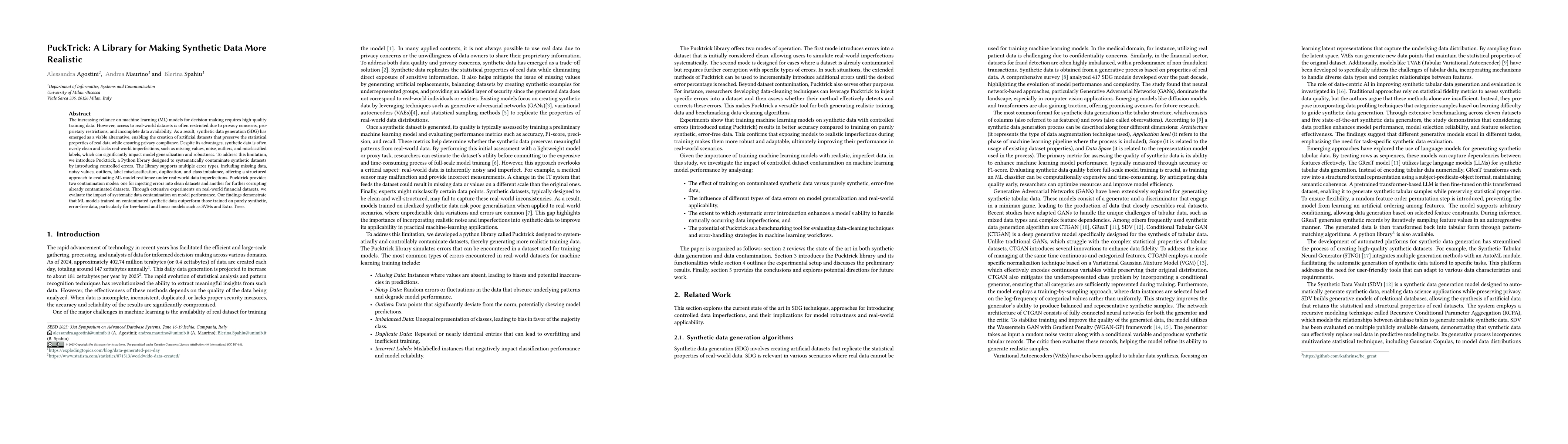 The increasing reliance on machine learning (ML) models for decision-making requires high-quality training data. However, access to real-world datasets is often restricted due to privacy concerns, proprietary restrictions, and incomplete data availability. As a result, synthetic data generation (SDG) has emerged as a viable alternative, enabling the creation of artificial datasets that preserve the statistical properties of real data while ensuring privacy compliance. Despite its advantages, synthetic data is often overly clean and lacks real-world imperfections, such as missing values, noise, outliers, and misclassified labels, which can significantly impact model generalization and robustness. To address this limitation, we introduce Pucktrick, a Python library designed to systematically contaminate synthetic datasets by introducing controlled errors. The library supports multiple error types, including missing data, noisy values, outliers, label misclassification, duplication, and class imbalance, offering a structured approach to evaluating ML model resilience under real-world data imperfections. Pucktrick provides two contamination modes: one for injecting errors into clean datasets and another for further corrupting already contaminated datasets. Through extensive experiments on real-world financial datasets, we evaluate the impact of systematic data contamination on model performance. Our findings demonstrate that ML models trained on contaminated synthetic data outperform those trained on purely synthetic, error-free data, particularly for tree-based and linear models such as SVMs and Extra Trees.