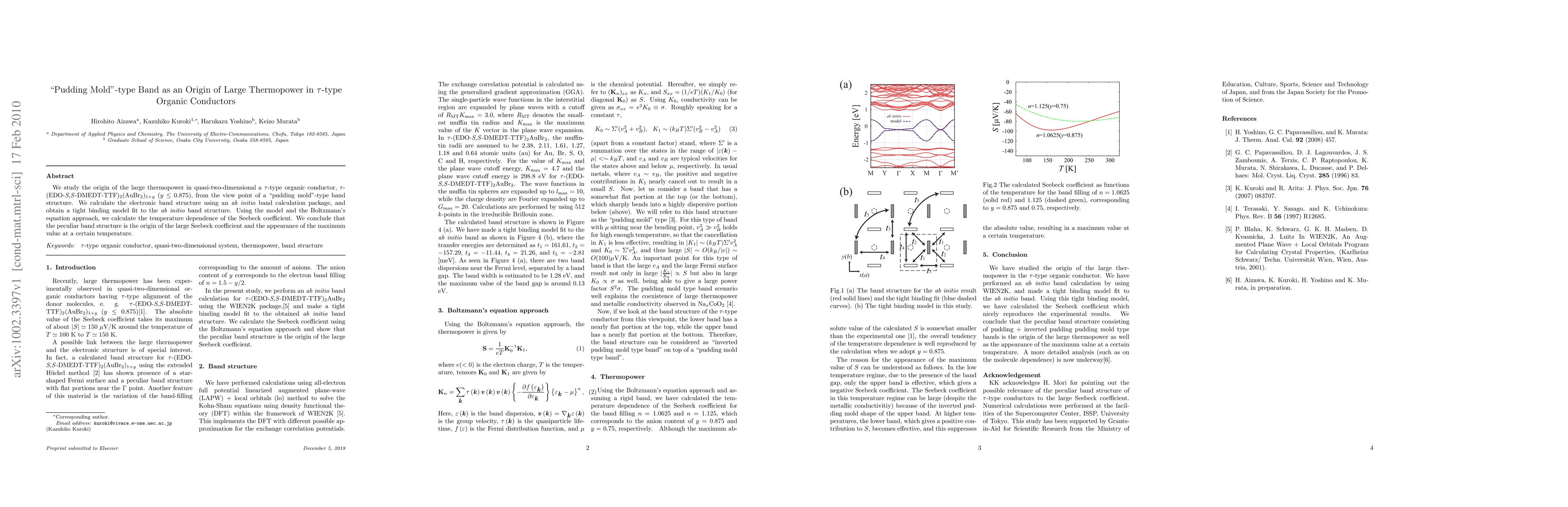 We study the origin of the large thermopower in quasi-two-dimensional a $\tau$-type organic conductor, $\tau-(EDO-S,S-DMEDT-TTF)_2(AuBr_2)_{1+y}$ ($y \le 0.875$), from the view point of a "pudding mold"-type band structure. We calculate the electronic band structure using an \textit{ab initio} band calculation package, and obtain a tight binding model fit to the \textit{ab initio} band structure. Using the model and the Boltzmann's equation approach, we calculate the temperature dependence of the Seebeck coefficient. We conclude that the peculiar band structure is the origin of the large Seebeck coefficient and the appearance of the maximum value at a certain temperature.