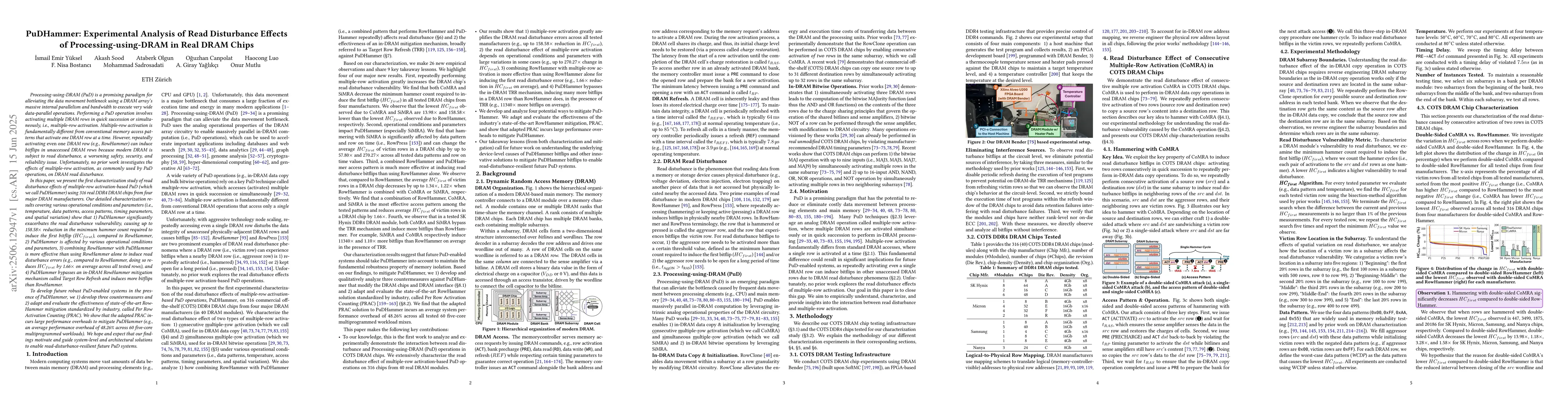 Processing-using-DRAM (PuD) is a promising paradigm for alleviating the data movement bottleneck using DRAM's massive internal parallelism and bandwidth to execute very wide operations. Performing a PuD operation involves activating multiple DRAM rows in quick succession or simultaneously, i.e., multiple-row activation. Multiple-row activation is fundamentally different from conventional memory access patterns that activate one DRAM row at a time. However, repeatedly activating even one DRAM row (e.g., RowHammer) can induce bitflips in unaccessed DRAM rows because modern DRAM is subject to read disturbance. Unfortunately, no prior work investigates the effects of multiple-row activation on DRAM read disturbance. In this paper, we present the first characterization study of read disturbance effects of multiple-row activation-based PuD (which we call PuDHammer) using 316 real DDR4 DRAM chips from four major DRAM manufacturers. Our detailed characterization show that 1) PuDHammer significantly exacerbates the read disturbance vulnerability, causing up to 158.58x reduction in the minimum hammer count required to induce the first bitflip ($HC_{first}$), compared to RowHammer, 2) PuDHammer is affected by various operational conditions and parameters, 3) combining RowHammer with PuDHammer is more effective than using RowHammer alone to induce read disturbance error, e.g., doing so reduces $HC_{first}$ by 1.66x on average, and 4) PuDHammer bypasses an in-DRAM RowHammer mitigation mechanism (Target Row Refresh) and induces more bitflips than RowHammer. To develop future robust PuD-enabled systems in the presence of PuDHammer, we 1) develop three countermeasures and 2) adapt and evaluate the state-of-the-art RowHammer mitigation standardized by industry, called Per Row Activation Counting (PRAC). We show that the adapted PRAC incurs large performance overheads (48.26%, on average).