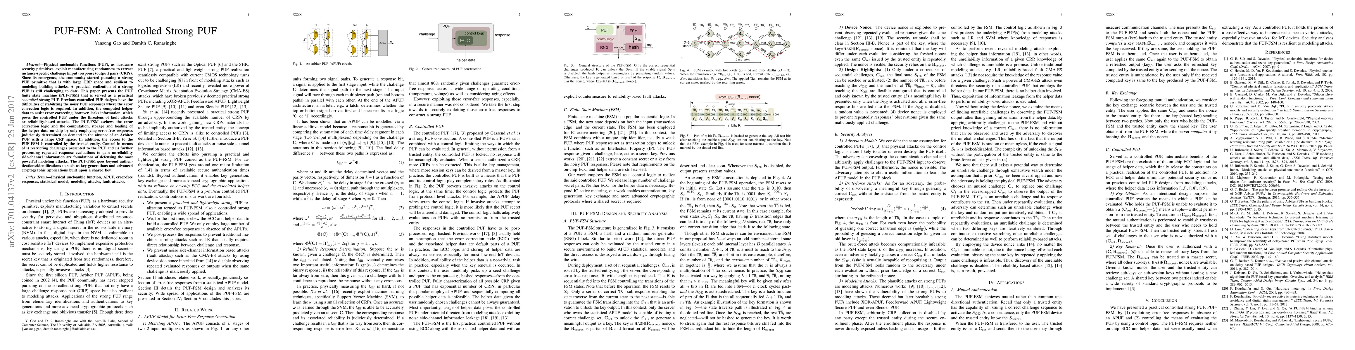 The PUF-FSM is a controlled strong PUF that avoids error correction and helper data to prevent information leakage, relying instead on error-free responses on demand. It is protected against modeling attacks through controlled access and challenge restrictions.