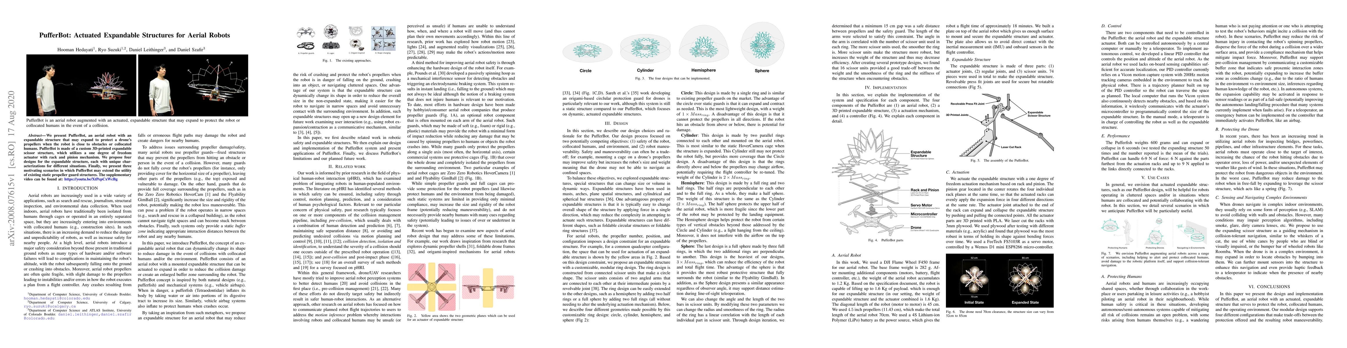 PufferBot is an innovative aerial robot featuring an expandable scissor structure that protects its propellers near obstacles or humans. The design employs a 3D-printed expandable mechanism with a one-degree-of-freedom actuator, offering four distinct configurations for various scenarios.