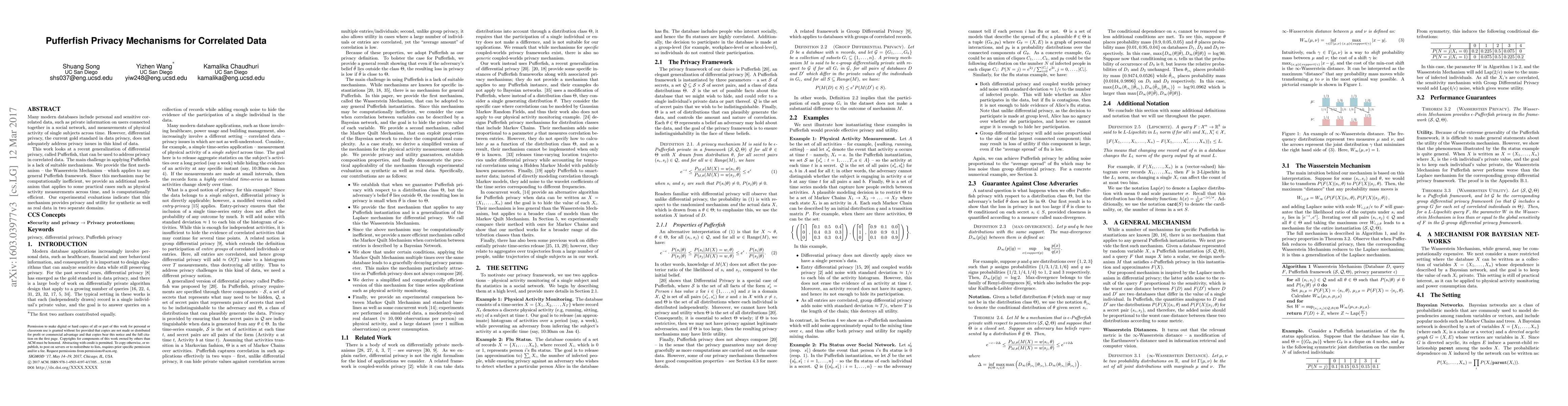 This paper introduces the Pufferfish privacy mechanism to address privacy concerns in correlated data, presenting the first Wasserstein Mechanism for general Pufferfish frameworks and a more efficient alternative for practical cases like time-series physical activity data. Experimental results show both mechanisms provide adequate privacy and utility for synthetic and real datasets.
