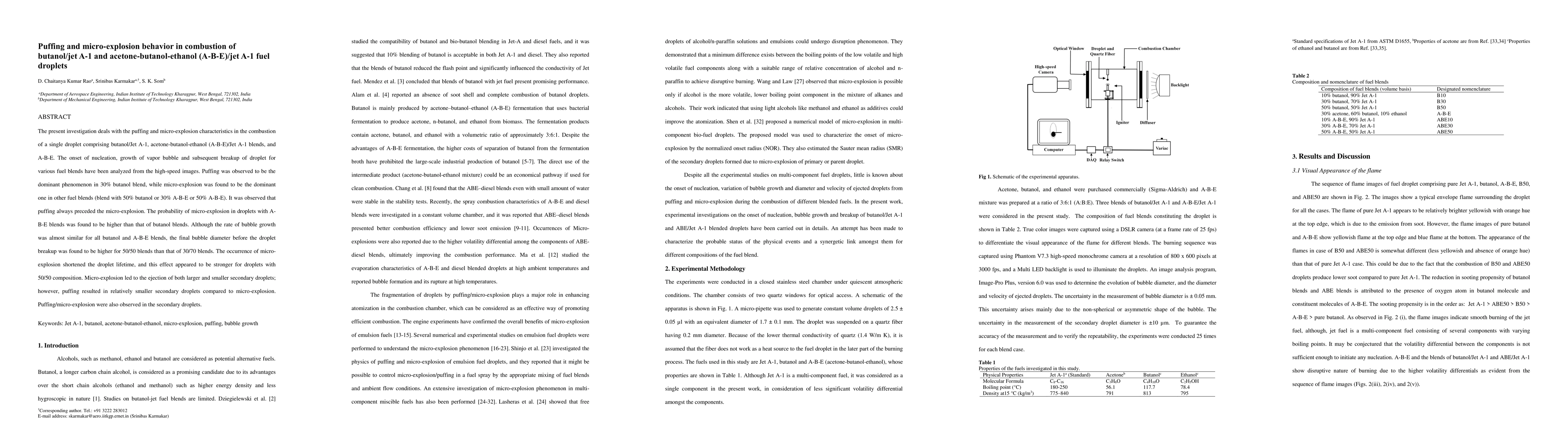 The present investigation deals with the puffing and micro-explosion characteristics in the combustion of a single droplet comprising butanol/Jet A-1, acetone-butanol-ethanol (A-B-E)/Jet A-1 blends, and A-B-E. The onset of nucleation, growth of vapor bubble and subsequent breakup of droplet for various fuel blends have been analyzed from the high-speed images. Puffing was observed to be the dominant phenomenon in 30% butanol blend, while micro-explosion was found to be the dominant one in other fuel blends (blend with 50% butanol or 30% A-B-E or 50% A-B-E). It was observed that puffing always preceded the micro-explosion. The probability of micro-explosion in droplets with A-B-E blends was found to be higher than that of butanol blends. Although the rate of bubble growth was almost similar for all butanol and A-B-E blends, the final bubble diameter before the droplet breakup was found to be higher for 50/50 blends than that of 30/70 blends. The occurrence of micro-explosion shortened the droplet lifetime, and this effect appeared to be stronger for droplets with 50/50 composition. Micro-explosion led to the ejection of both larger and smaller secondary droplets; however, puffing resulted in relatively smaller secondary droplets compared to micro-explosion. Puffing/micro-explosion were also observed in the secondary droplets.