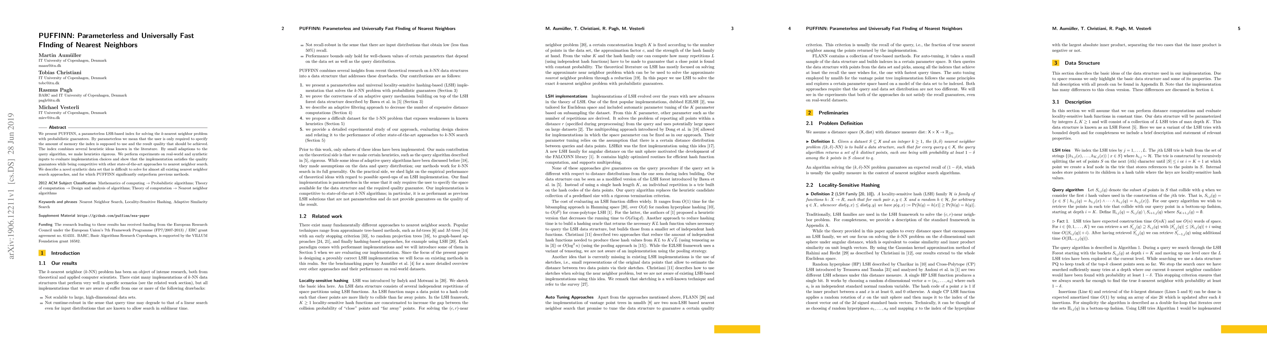 We present PUFFINN, a parameterless LSH-based index for solving the $k$-nearest neighbor problem with probabilistic guarantees. By parameterless we mean that the user is only required to specify the amount of memory the index is supposed to use and the result quality that should be achieved. The index combines several heuristic ideas known in the literature. By small adaptions to the query algorithm, we make heuristics rigorous. We perform experiments on real-world and synthetic inputs to evaluate implementation choices and show that the implementation satisfies the quality guarantees while being competitive with other state-of-the-art approaches to nearest neighbor search. We describe a novel synthetic data set that is difficult to solve for almost all existing nearest neighbor search approaches, and for which PUFFINN significantly outperform previous methods.