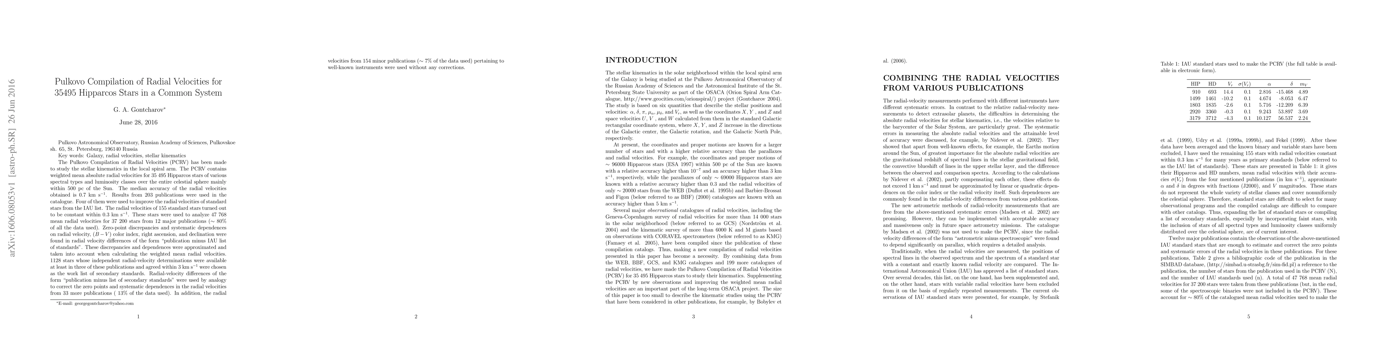 The Pulkovo Compilation of Radial Velocities (PCRV) has been made to study the stellar kinematics in the local spiral arm. The PCRV contains weighted mean absolute radial velocities for 35 495 Hipparcos stars of various spectral types and luminosity classes over the entire celestial sphere mainly within 500 pc of the Sun. The median accuracy of the radial velocities obtained is 0.7 km s$^{-1}$. Results from 203 publications were used in the catalogue. Four of them were used to improve the radial velocities of standard stars from the IAU list. The radial velocities of 155 standard stars turned out to be constant within 0.3 km s$^{-1}$. These stars were used to analyze 47 768 mean radial velocities for 37 200 stars from 12 major publications ($\sim80\%$ of all the data used). Zero-point discrepancies and systematic dependences on radial velocity, $(B-V)$ color index, right ascension, and declination were found in radial velocity differences of the form "publication minus IAU list of standards". These discrepancies and dependences were approximated and taken into account when calculating the weighted mean radial velocities. 1128 stars whose independent radial-velocity determinations were available at least in three of these publications and agreed within 3 km s$^{-1}$ were chosen as the work list of secondary standards. Radial-velocity differences of the form "publication minus list of secondary standards" were used by analogy to correct the zero points and systematic dependences in the radial velocities from 33 more publications (~13\% of the data used). In addition, the radial velocities from 154 minor publications ($\sim7\%$ of the data used) pertaining to well-known instruments were used without any corrections.
