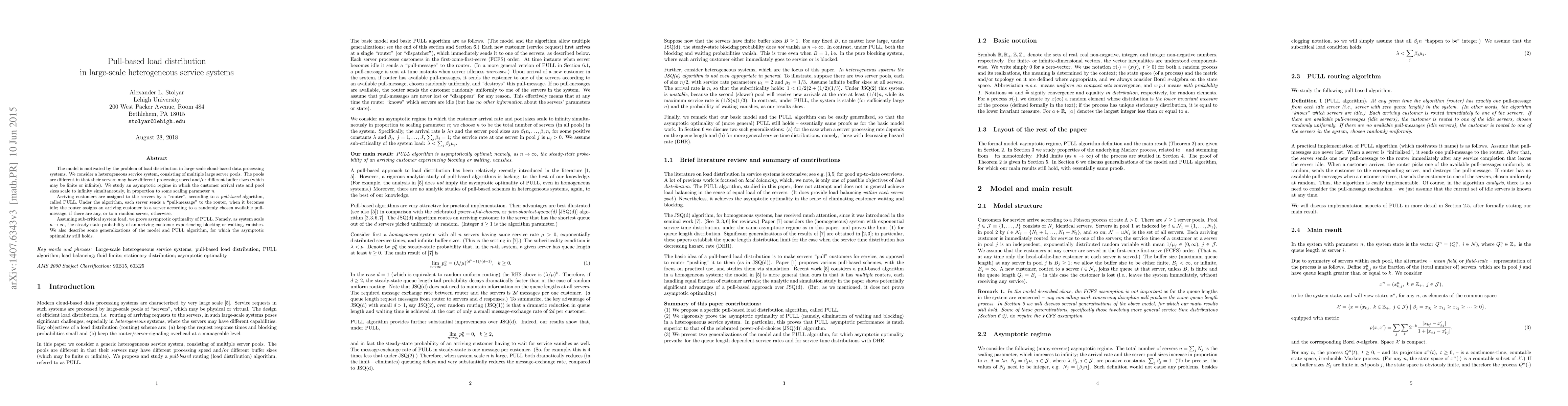 This research paper investigates a pull-based load distribution algorithm in large-scale cloud computing systems with heterogeneous server pools. It finds asymptotic optimality of the PULL algorithm under sub-critical system load conditions.