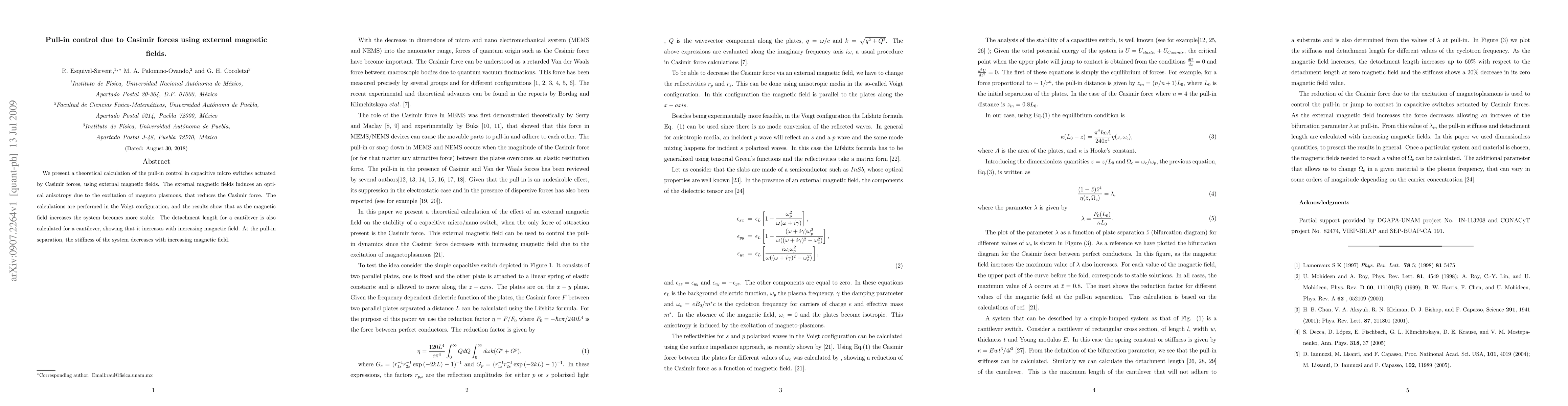 We present a theoretical calculation of the pull-in control in capacitive micro switches actuated by Casimir forces, using external magnetic fields. The external magnetic fields induces an optical anisotropy due to the excitation of magneto plasmons, that reduces the Casimir force. The calculations are performed in the Voigt configuration, and the results show that as the magnetic field increases the system becomes more stable. The detachment length for a cantilever is also calculated for a cantilever, showing that it increases with increasing magnetic field. At the pull-in separation, the stiffness of the system decreases with increasing magnetic field.