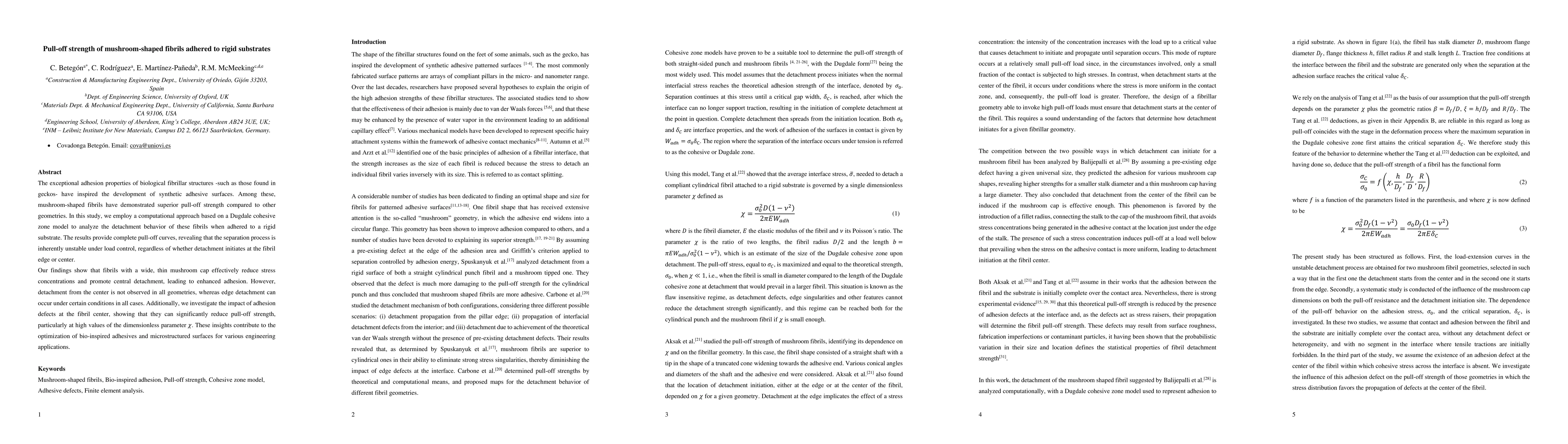 The exceptional adhesion properties of biological fibrillar structures -- such as those found in geckos -- have inspired the development of synthetic adhesive surfaces. Among these, mushroom-shaped fibrils have demonstrated superior pull-off strength compared to other geometries. In this study, we employ a computational approach based on a Dugdale cohesive zone model to analyze the detachment behavior of these fibrils when adhered to a rigid substrate. The results provide complete pull-off curves, revealing that the separation process is inherently unstable under load control, regardless of whether detachment initiates at the fibril edge or center. Our findings show that fibrils with a wide, thin mushroom cap effectively reduce stress concentrations and promote central detachment, leading to enhanced adhesion. However, detachment from the center is not observed in all geometries, whereas edge detachment can occur under certain conditions in all cases. Additionally, we investigate the impact of adhesion defects at the fibril center, showing that they can significantly reduce pull-off strength, particularly at high values of the dimensionless parameter \c{hi}. These insights contribute to the optimization of bio-inspired adhesives and microstructured surfaces for various engineering applications.