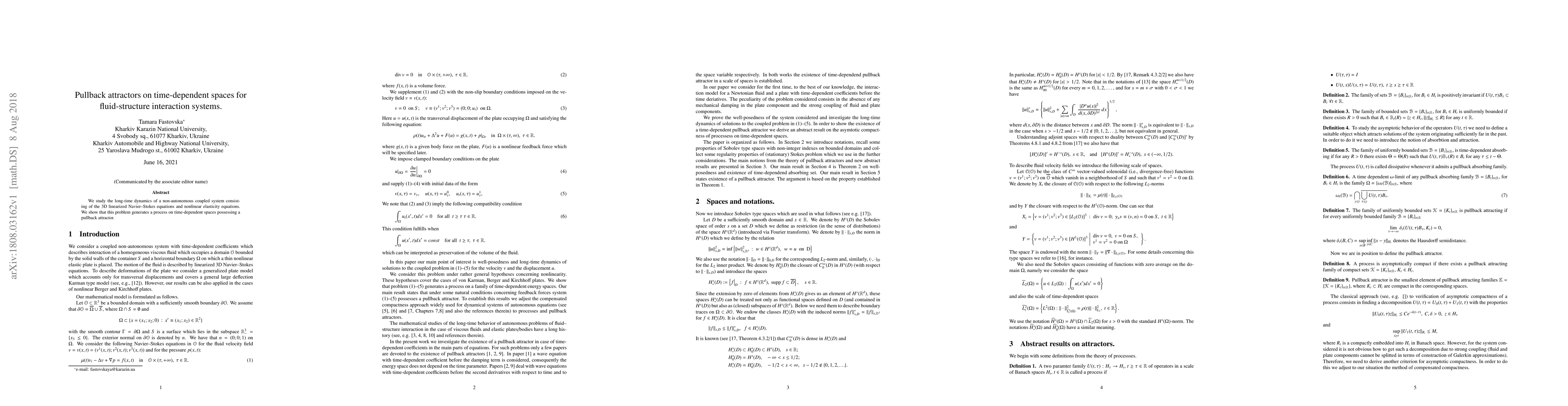 We study the long-time dynamics of a non-autonomous coupled system consisting of the 3D linearized Na\-vier--Stokes equations and nonlinear elasticity equations. We show that this problem generates a process on time-dependent spaces possessing a pullback attractor.