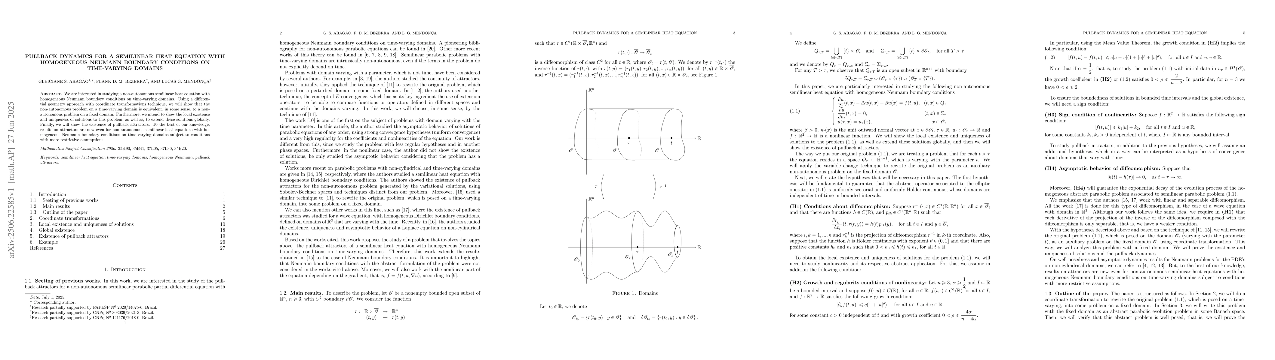 This paper explores a semilinear heat equation with Neumann boundary conditions on changing domains, proving equivalence to a fixed-domain problem using differential geometry. It establishes local and global existence and uniqueness of solutions, and identifies pullback attractors, presenting novel results for such non-autonomous equations under specific assumptions.