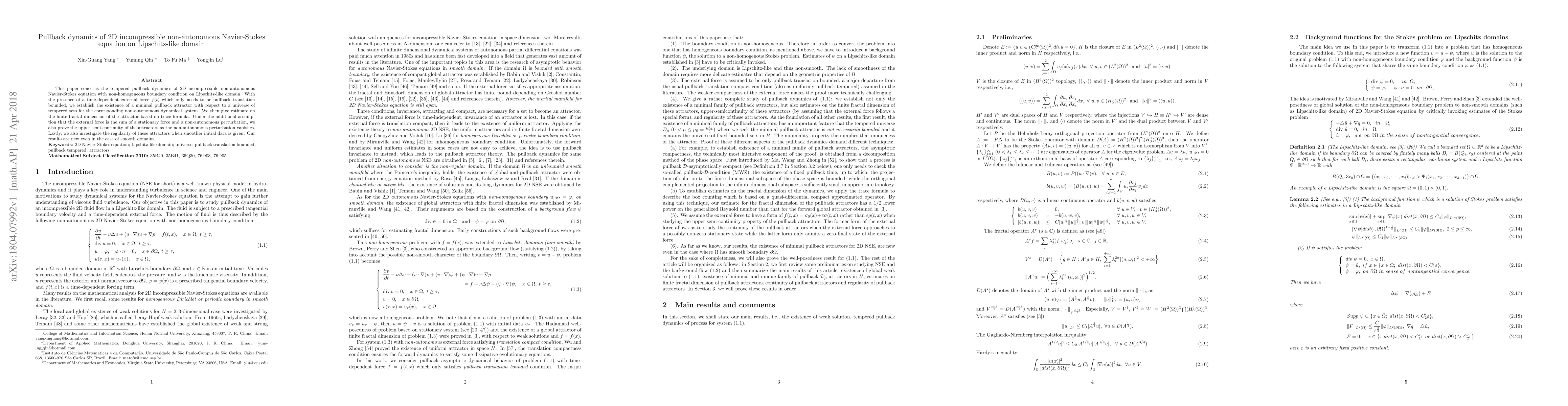 This paper concerns the tempered pullback dynamics of 2D incompressible non-autonomous Navier-Stokes equation with non-homogeneous boundary condition on Lipschitz-like domain. With the presence of a time-dependent external force f(t) which only needs to be pullback translation bounded, we establish the existence of a minimal pullback attractor with respect to a universe of tempered sets for the corresponding non-autonomous dynamical system. We then give estimate on the finite fractal dimension of the attractor based on trace formula. Under the additional assumption that the external force is the sum of a stationary force and a non-autonomous perturbation, we also prove the upper semi-continuity of the attractors as the non-autonomous perturbation vanishes. Lastly, we also investigate the regularity of these attractors when smoother initial data is given. Our results are new even in the case of smooth domains.