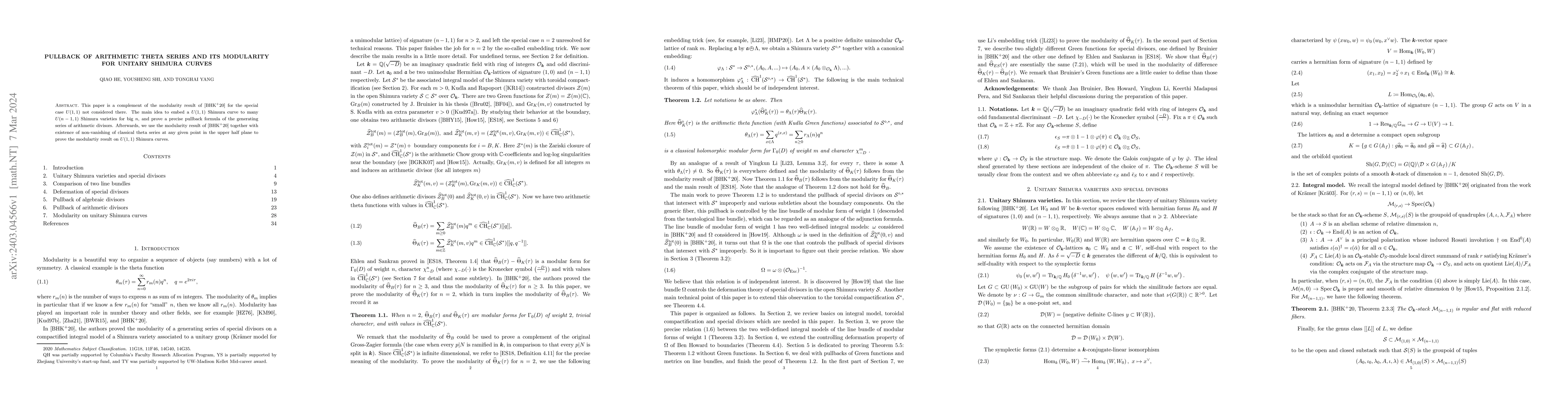 This paper complements the modularity results for $U(1,1)$ Shimura curves by embedding them into larger $U(n-1, 1)$ Shimura varieties and proving a pullback formula for arithmetic theta series, ultimately leveraging existing modularity results to establish modularity for $U(1,1)$.