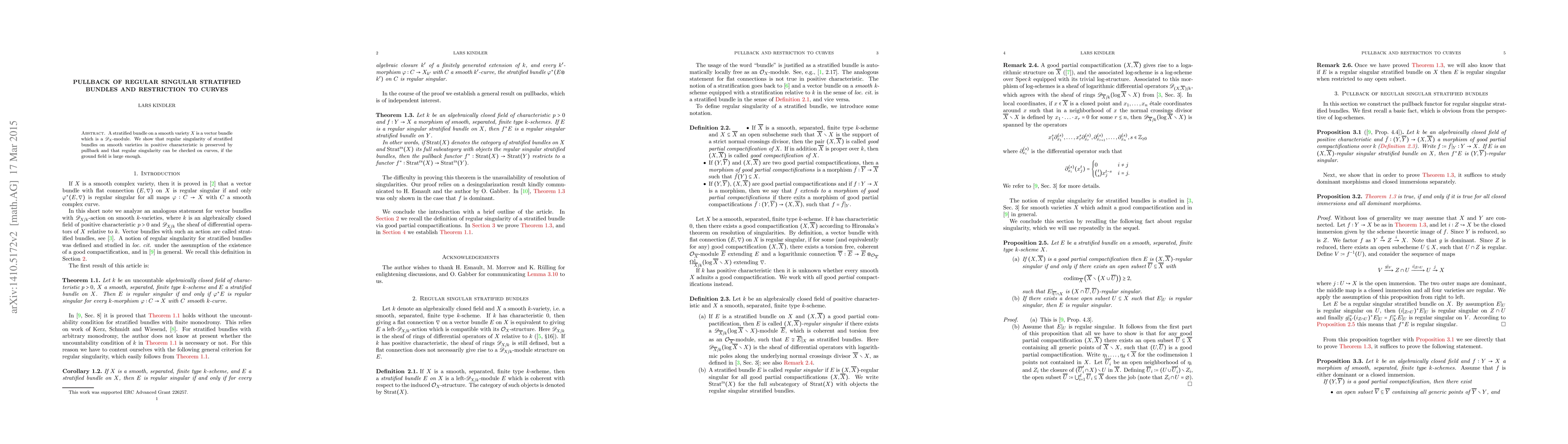 Summary: This paper demonstrates that the regular singularity property of stratified bundles on smooth varieties in positive characteristic remains intact under pullback, and verifies that this property can be confirmed through restriction to curves, provided the ground field is sufficiently large.