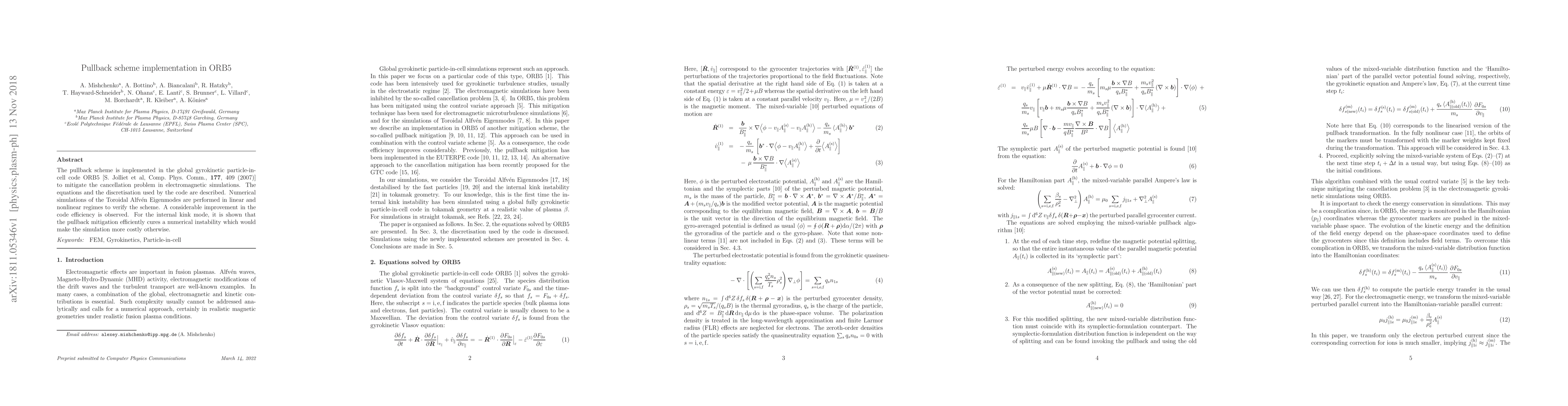 The pullback scheme has been implemented in the global gyrokinetic particle-in-cell code ORB5, with solver modifications described for the scheme. The scheme was verified using the ITPA-TAE benchmark in both linear and nonlinear regimes.