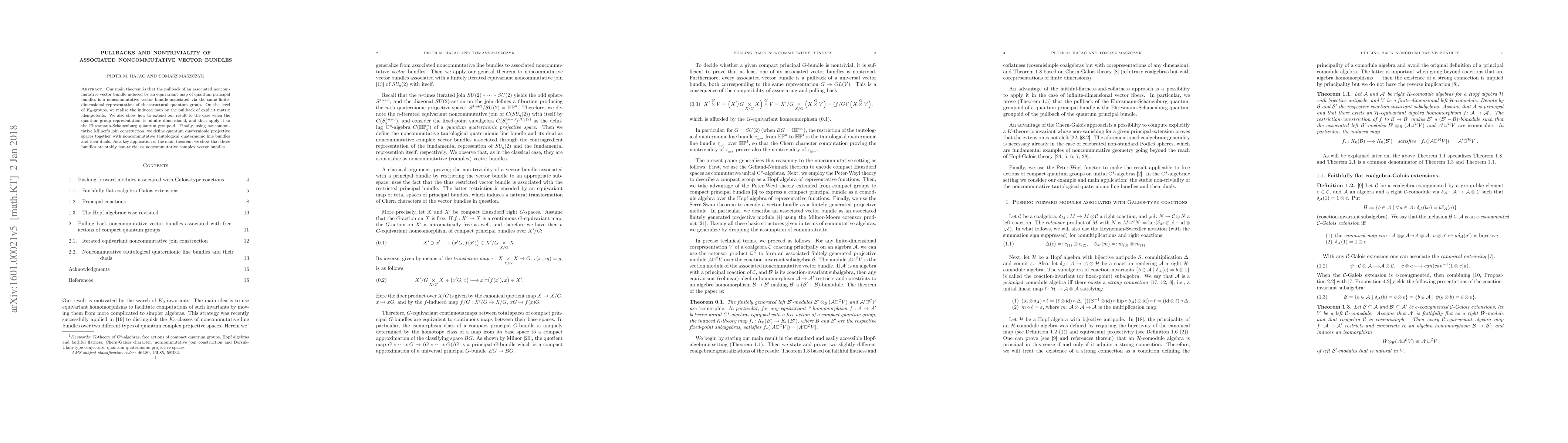 The paper demonstrates that the pullback of a noncommutative vector bundle induced by an equivariant map between quantum principal bundles remains a noncommutative vector bundle associated with the same representation. It also explores extensions to infinite-dimensional representations and applies these findings to quantum groupoids, defining quantum quaternionic projective spaces and proving their noncommutative tautological bundles are stably nontrivial.