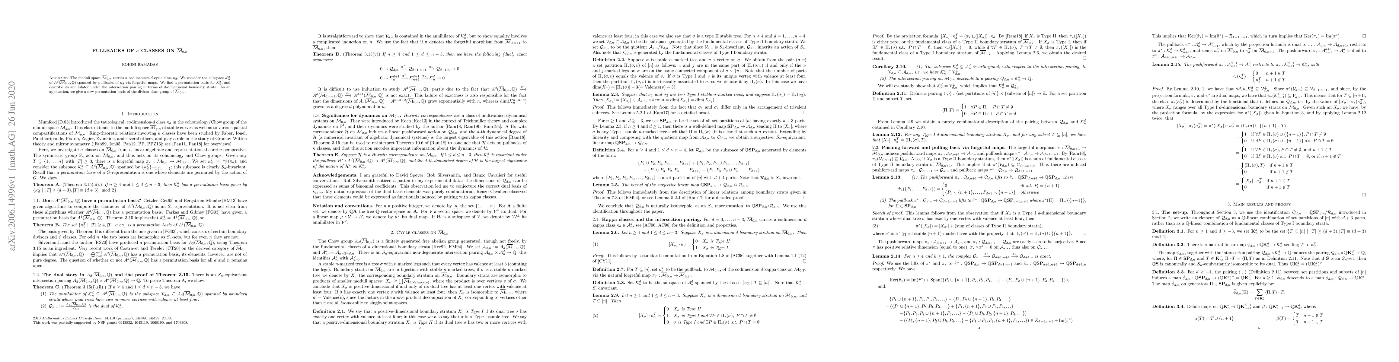 The paper establishes a permutation basis for $\mathcal{K}^{d}_{n}$ and describes its annihilator under the intersection pairing, providing a comprehensive framework for understanding pullbacks of $\kappa$ classes.