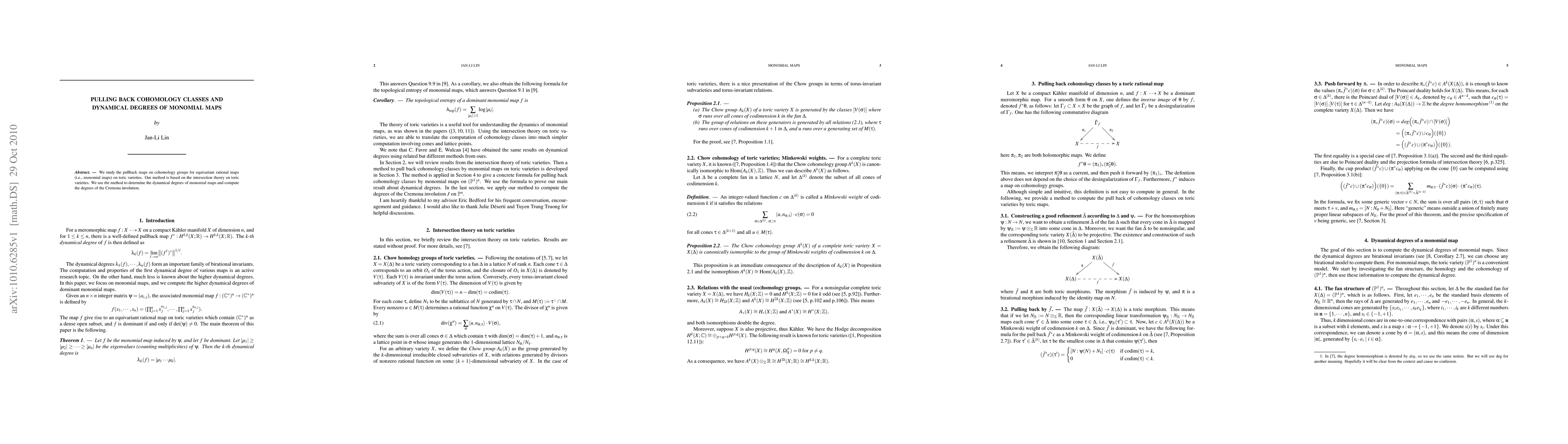 This research examines pullback maps on cohomology for equivariant rational maps (monomial maps) on toric varieties, utilizing intersection theory. The study determines dynamical degrees of monomial maps and calculates the degrees of the Cremona involution.