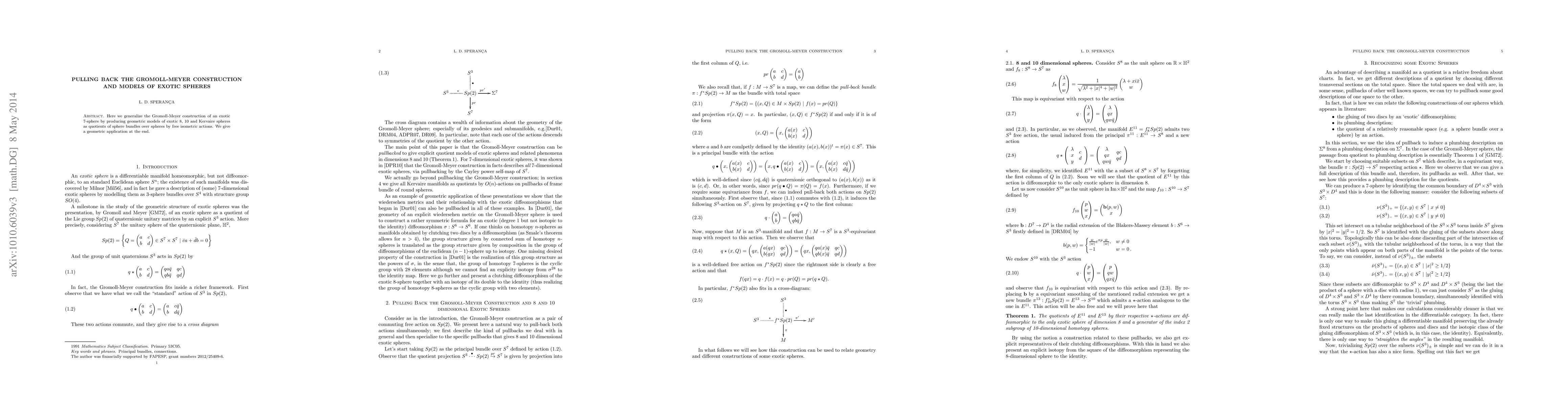 This paper generalizes the Gromoll-Meyer construction to create geometric models of exotic spheres in dimensions 8, 10, and Kervaire, using sphere bundles over spheres with free isometric actions. It concludes with a geometric application of the developed models.