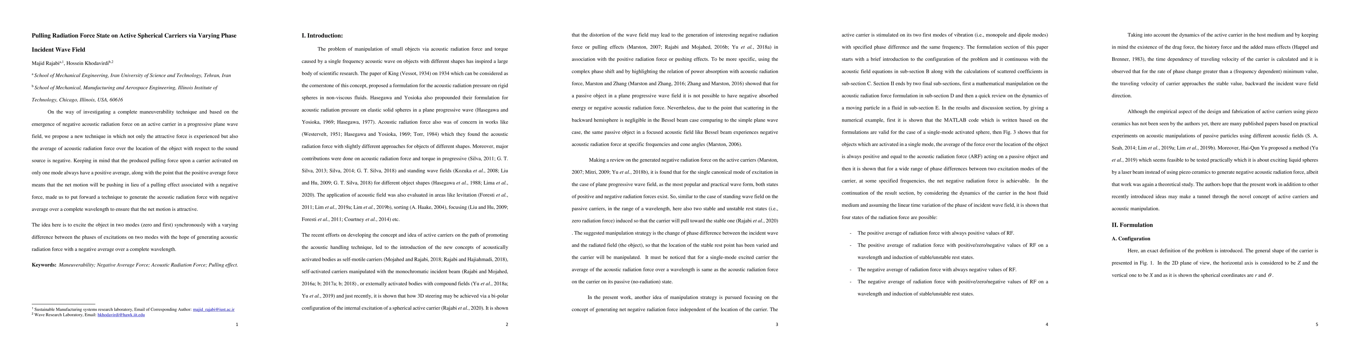 Researchers propose a technique to generate acoustic radiation force with a negative average over a complete wavelength, ensuring an attractive net motion in spherical carriers, by exciting two modes of the carrier with varying phase differences.