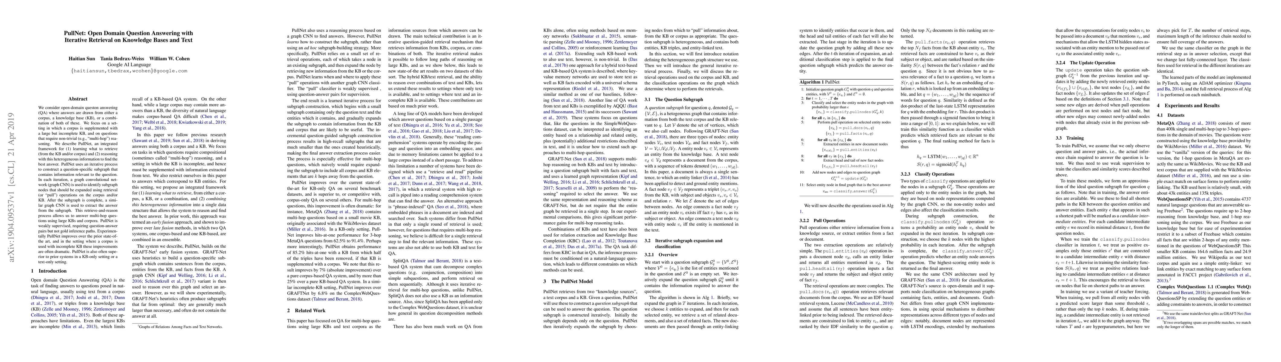 PullNet improves open-domain question answering by iteratively retrieving and reasoning with knowledge bases and text to answer multi-hop questions. It outperforms prior state-of-the-art in various settings, including those using incomplete knowledge bases.