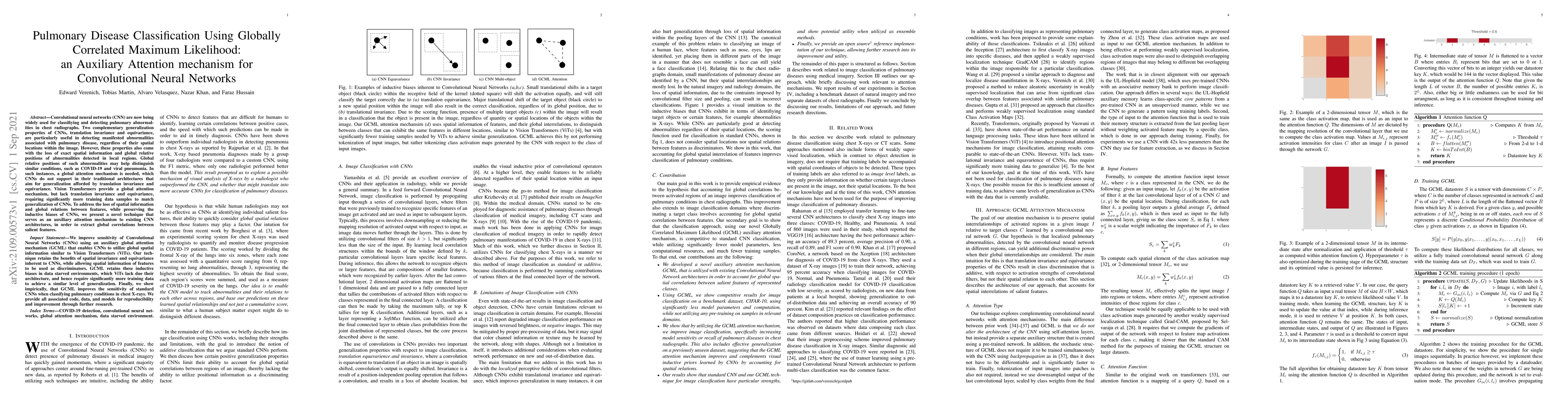 Convolutional neural networks (CNN) are now being widely used for classifying and detecting pulmonary abnormalities in chest radiographs. Two complementary generalization properties of CNNs, translation invariance and equivariance, are particularly useful in detecting manifested abnormalities associated with pulmonary disease, regardless of their spatial locations within the image. However, these properties also come with the loss of exact spatial information and global relative positions of abnormalities detected in local regions. Global relative positions of such abnormalities may help distinguish similar conditions, such as COVID-19 and viral pneumonia. In such instances, a global attention mechanism is needed, which CNNs do not support in their traditional architectures that aim for generalization afforded by translation invariance and equivariance. Vision Transformers provide a global attention mechanism, but lack translation invariance and equivariance, requiring significantly more training data samples to match generalization of CNNs. To address the loss of spatial information and global relations between features, while preserving the inductive biases of CNNs, we present a novel technique that serves as an auxiliary attention mechanism to existing CNN architectures, in order to extract global correlations between salient features.